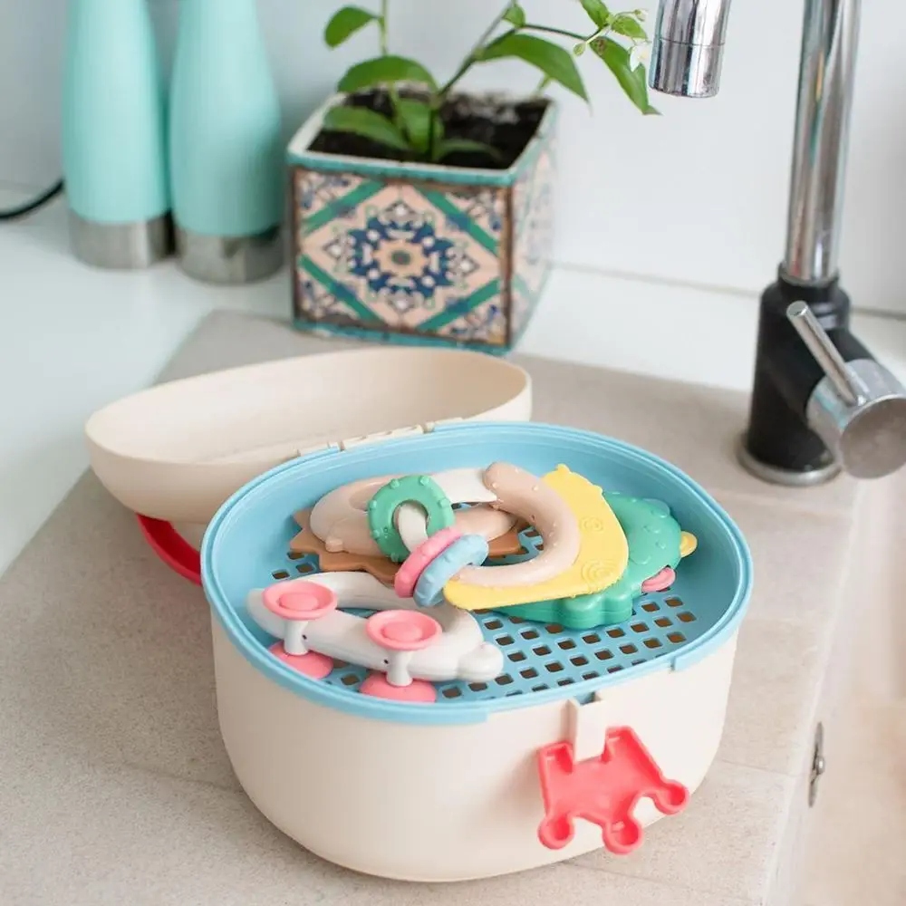 - Внутри есть специальная решетка, которая, с одной стороны, позволяет сушить игрушки после промывки, с другой стороны, она может выполнять функцию сита для скрининга песка во время игры в песочнице,