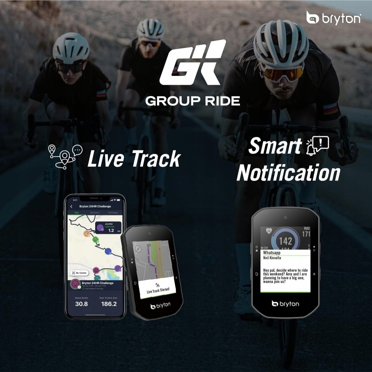 Отправьтесь в путешествие на велосипеде благодаря функциям Group Ride и Live Track. Создайте групповую поездку в приложении Bryton Active и пригласите на нее своих друзей и членов команды. Члены группы могут получать обновления и сообщения от участников группы в реальном времени. Эта функция позволяет велосипедистам оставаться на связи, отправлять сообщения и наслаждаться совместной ездой. В отличие от групповой поездки, Live Track позволяет гонщикам делиться своим местоположением в реальном времени с друзьями и семьей. Как только Live Track будет включен, будет создана ссылка для общего доступа. Используя ссылку Live Track, любой может проверить текущий статус велосипедиста, включая местоположение в реальном времени, текущую скорость, время в пути, расстояние и время последнего обновления.