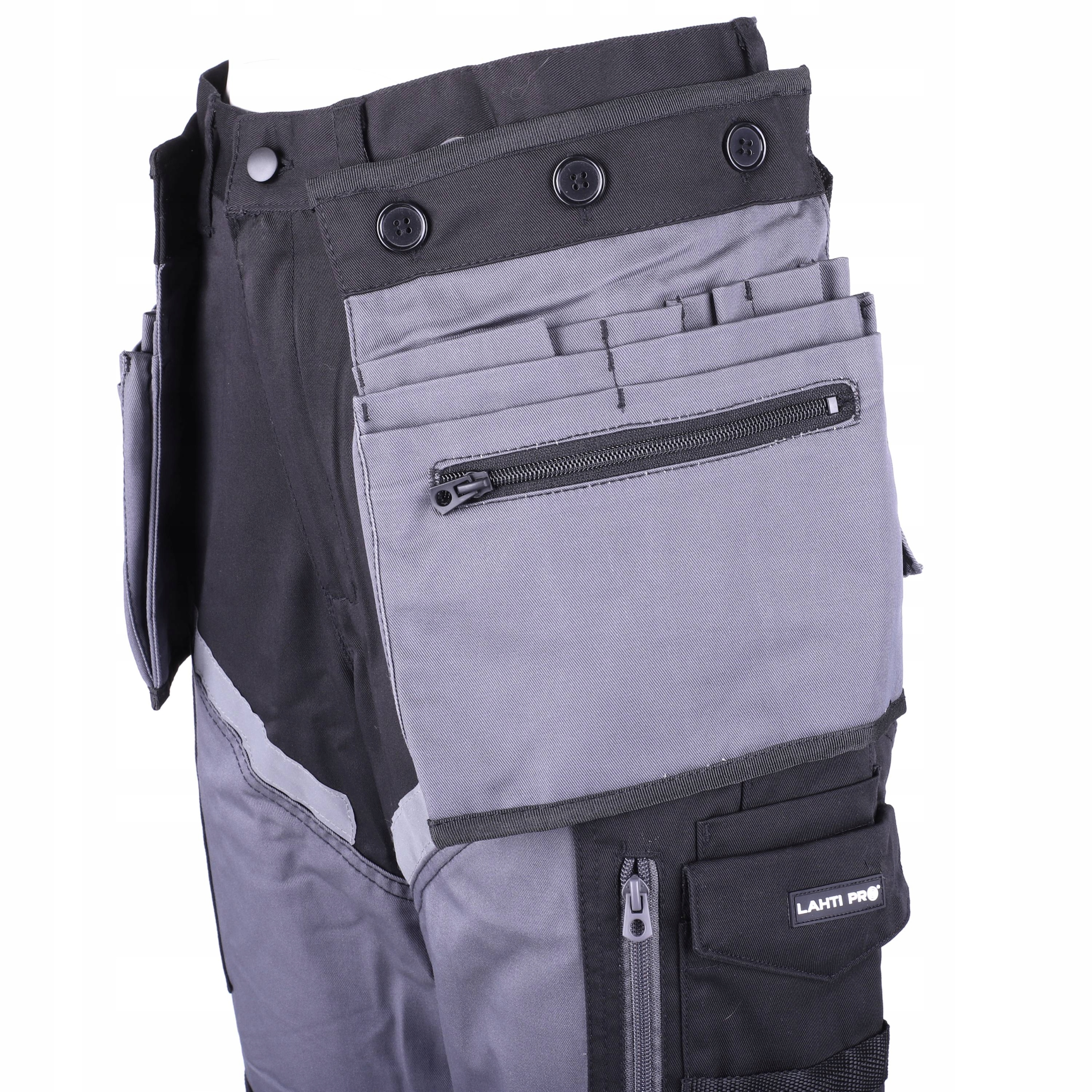 Регулировка ширины талии с помощью пуговиц и резинки. Специальная конструкция пряжки предотвращает скольжение. Дополнительно на брюках имеется каплевидное отверстие, две петли для молотка и два держателя линейки.