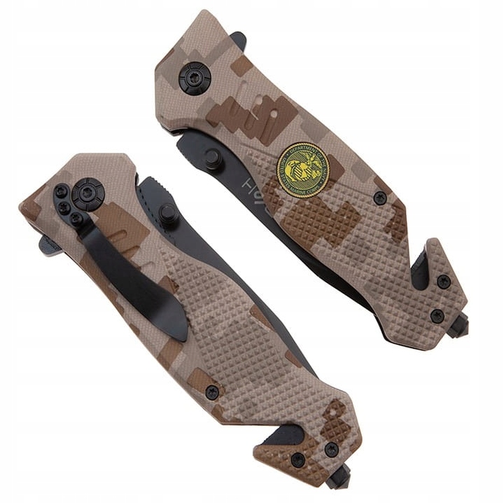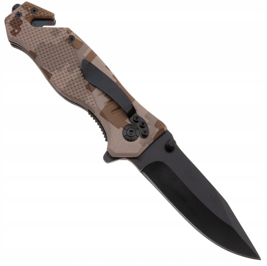 Складной нож в камуфляжном цвете оснащен необходимыми элементами, такими как стекло прерыватель и безопасное лезвие для перерезания ремней и веревок.