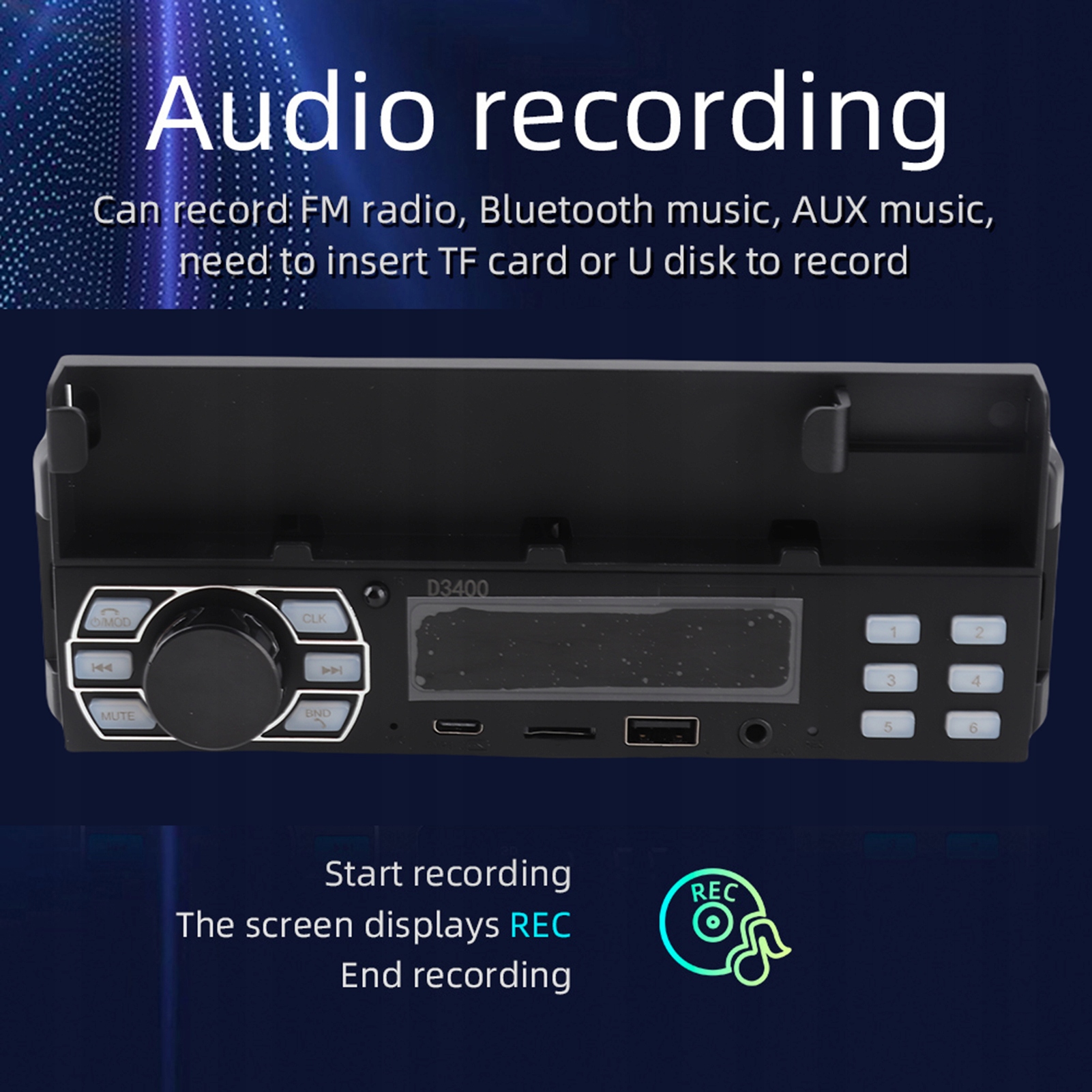 5. Благодаря порту зарядки Type-C и USB, высокой эффективности зарядки, не беспокойтесь о том, что ваш телефон не будет двигаться во время навигации. Поддержка записи звука, вставка TF-карты или U-диска (не входит в комплект). Вы можете записывать радиопередачи, BT Audio и Aux Audio.