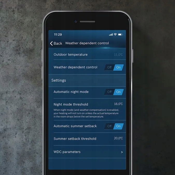- Использует датчик внешней комнатной температуры или данные о погоде из Интернета, чтобы эффективно установить желаемую комнатную температуру