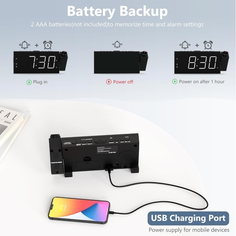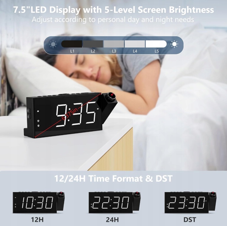 Просыпайтесь комфортно и стильно с потолочным будильником Mesqool! Эти современные часы белого цвета с большим 7-дюймовым светодиодным дисплеем станут идеальным решением для спальни, офиса или кухни. Его уникальная функция проецирования времени на стену или потолок, двойной будильник, регулируемая яркость и возможность зарядки через USB делают его универсальным и элегантным дополнением к любому интерьеру.