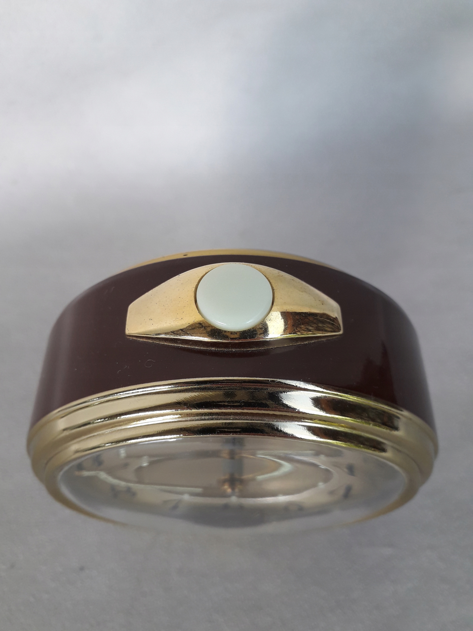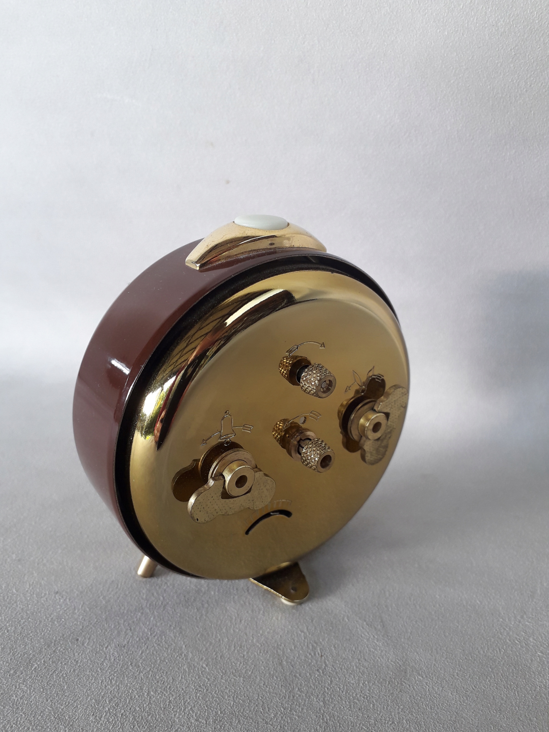 Часы оснащены верхним переключателем и классическими бабочками для завода механизма и будильника.
