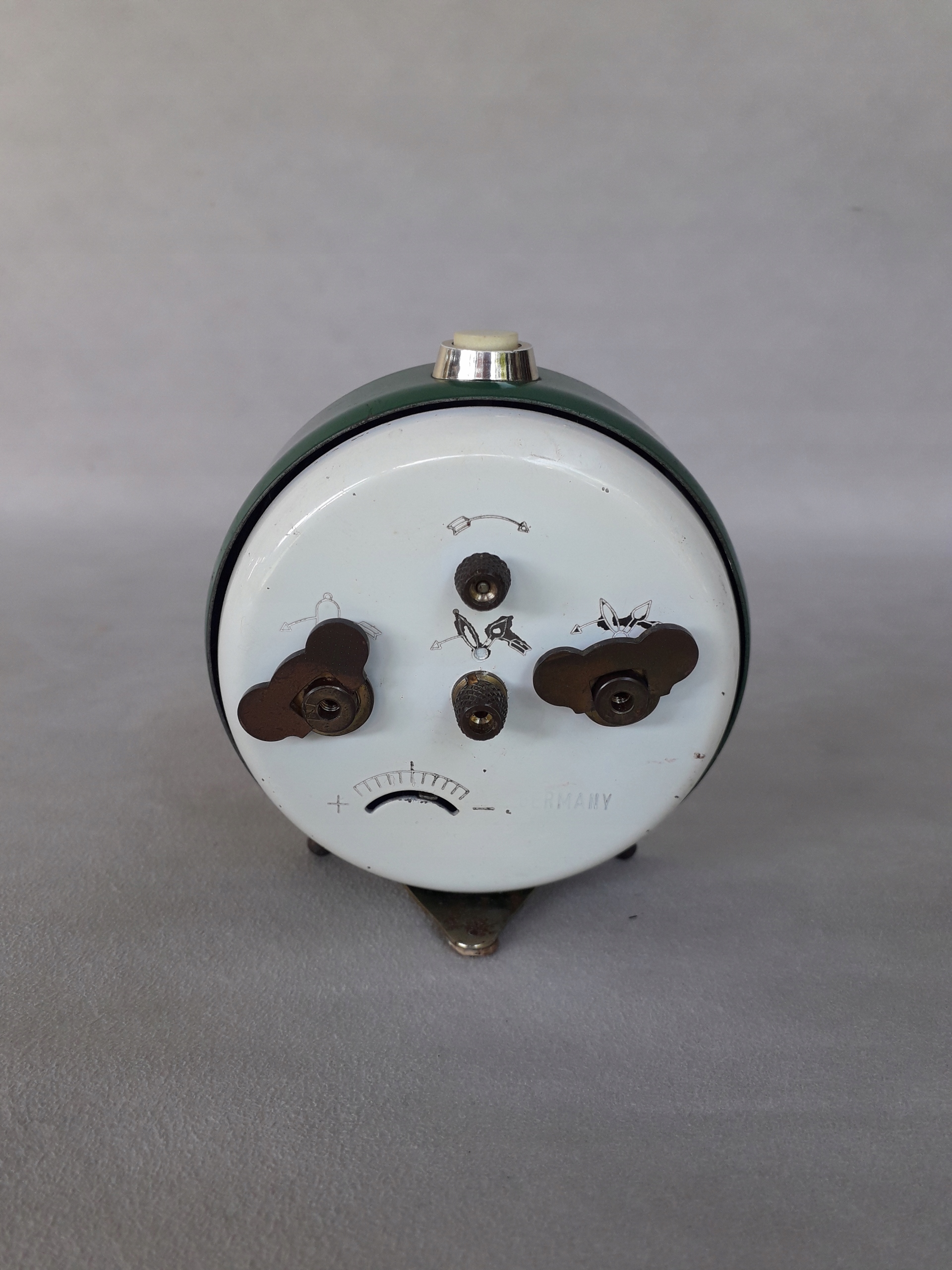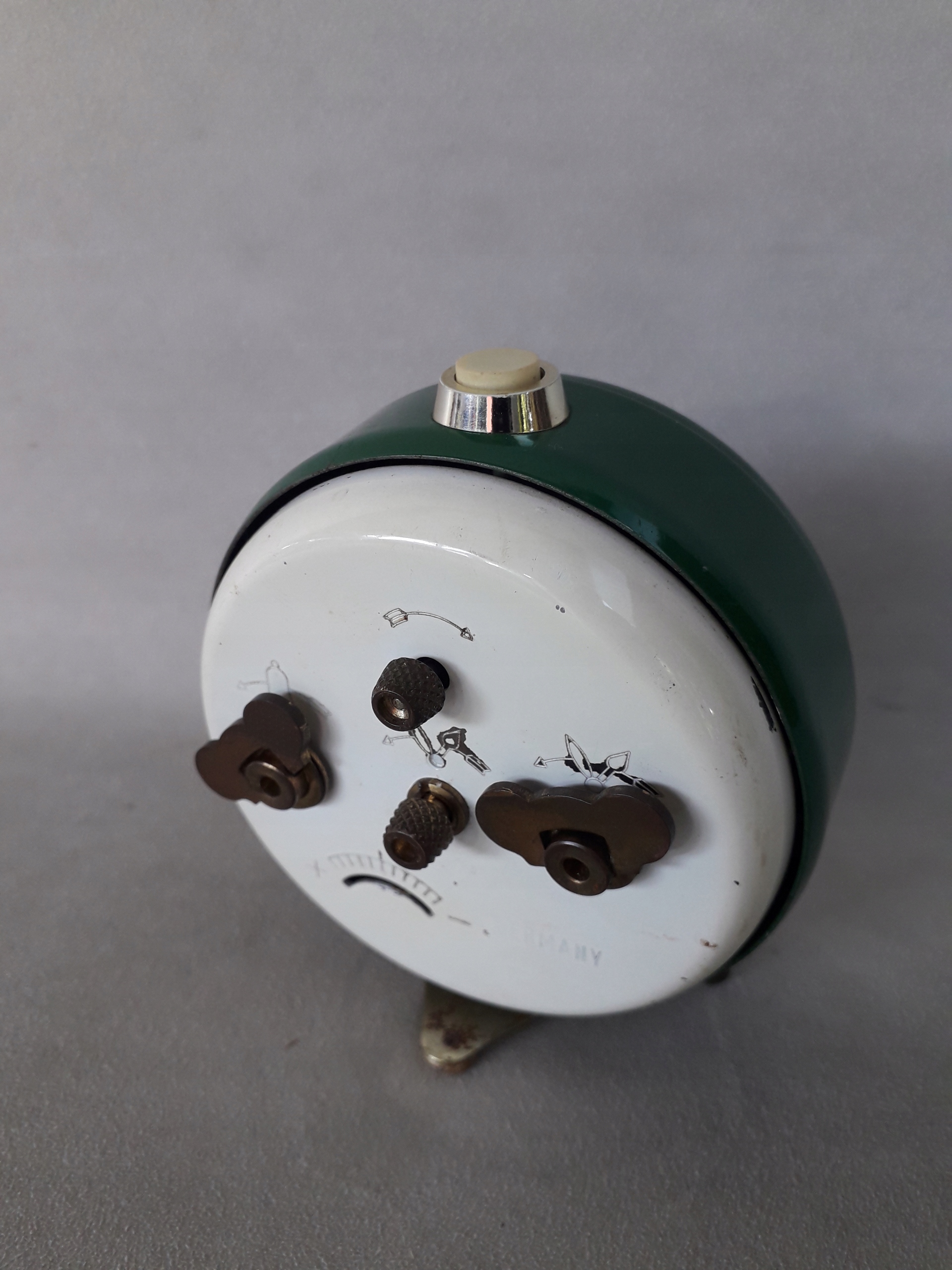 Часы оснащены верхним переключателем и классическими бабочками для завода механизма и будильника.