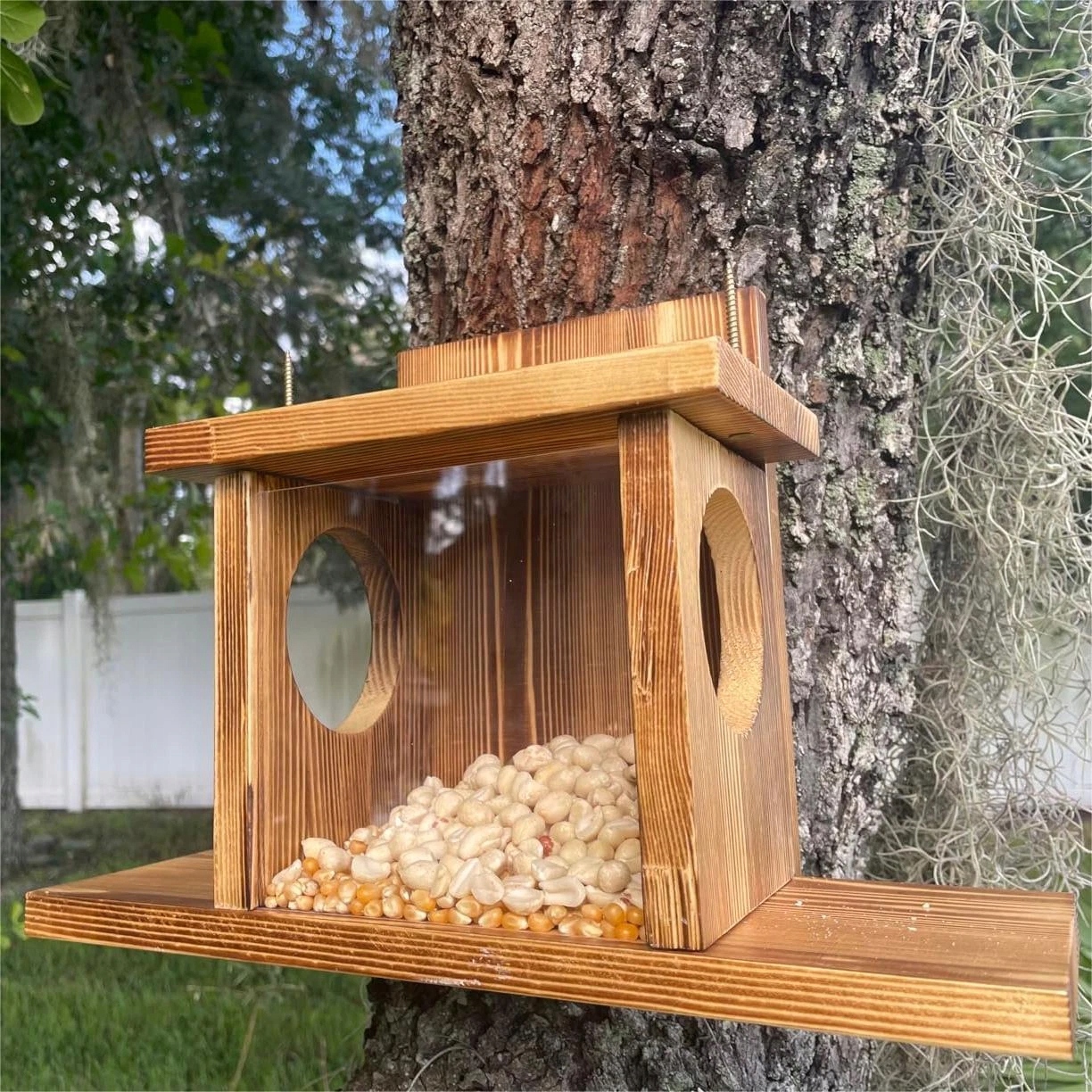 Эта кормушка для белок изготовлена из прочной древесины и имеет верхнюю часть из прочного оргстекла. Структура очень стабильна. Он устойчив к ветру и дождю, поэтому вы можете легко наполнять еду, не беспокоясь о том, что она намокнет.