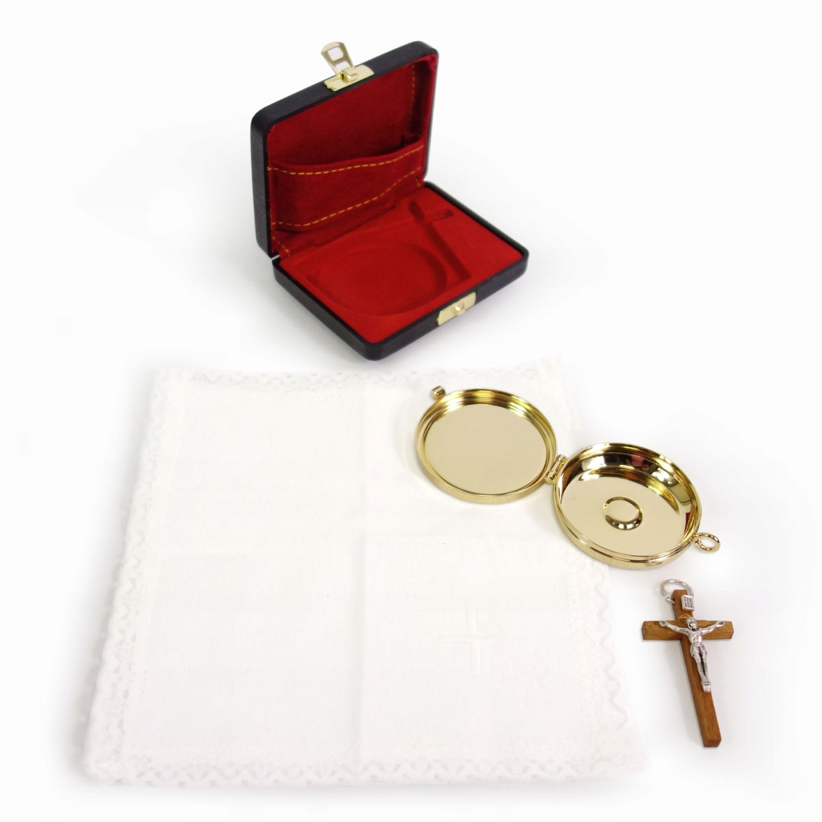 Все это помещается в небольшой чемодан, обитый внутри мягкой красной тканью. Внешняя часть чемодана черная, с маленьким золотым крестом. Чемодан легко открывается и закрывается. Это очень практично.