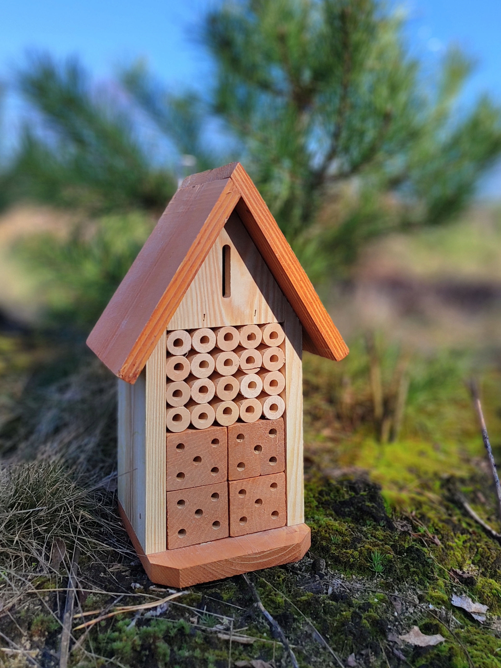 Домик/гостиница для насекомых из древесины сосны, высотой 31,5 см, 3 этажа и дополнительным крючком, позволяющим повесить его в любом выбранном месте.