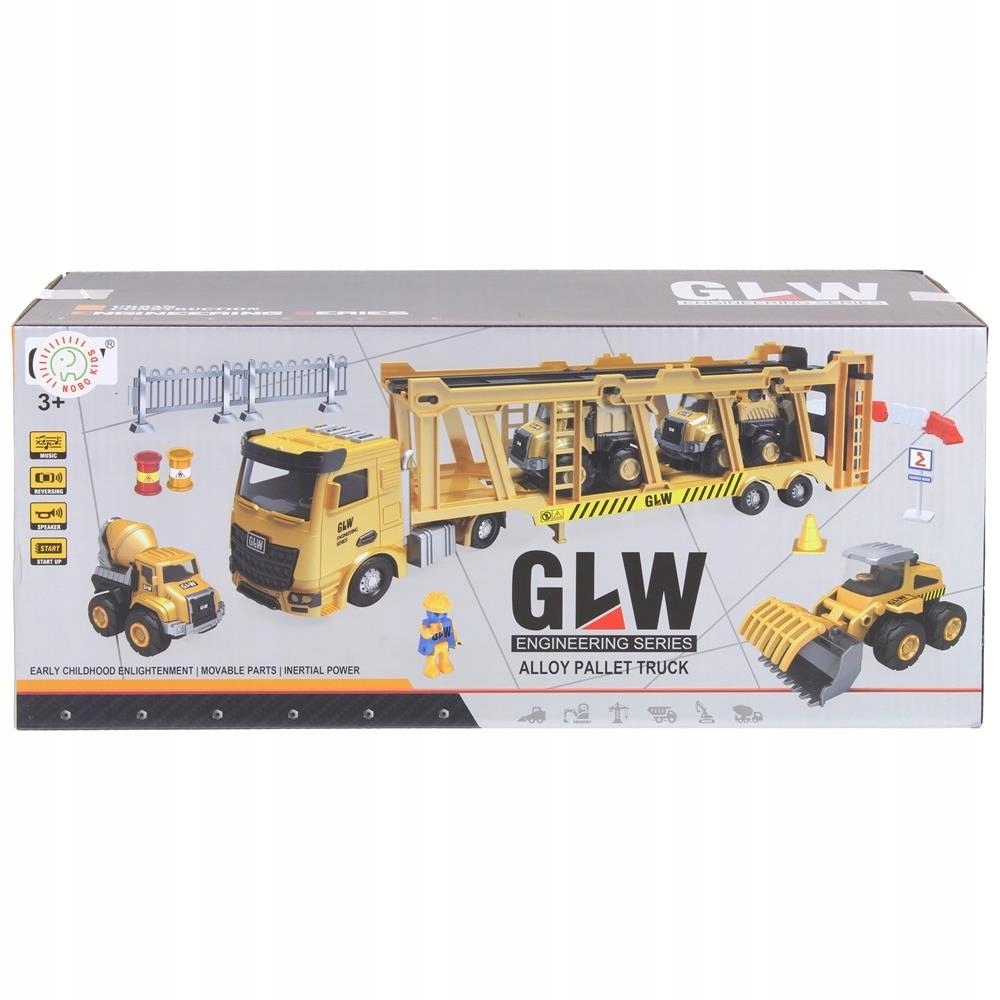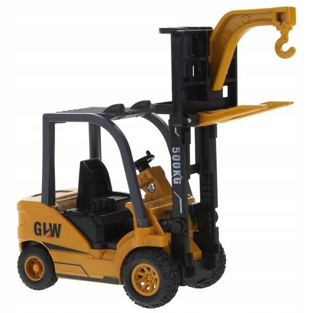 - Размеры (приблизительные): грузовик с эвакуатором: 47 х 9 х 13 см; экскаватор: 12 х 5 х 6 см; вилочный погрузчик: 12 х 4,5 х 7,5 см; зарядное устройство: 13 х 5,5 х 5,5 см; кран: высота 42 см, длина стрелы 37,5 см.