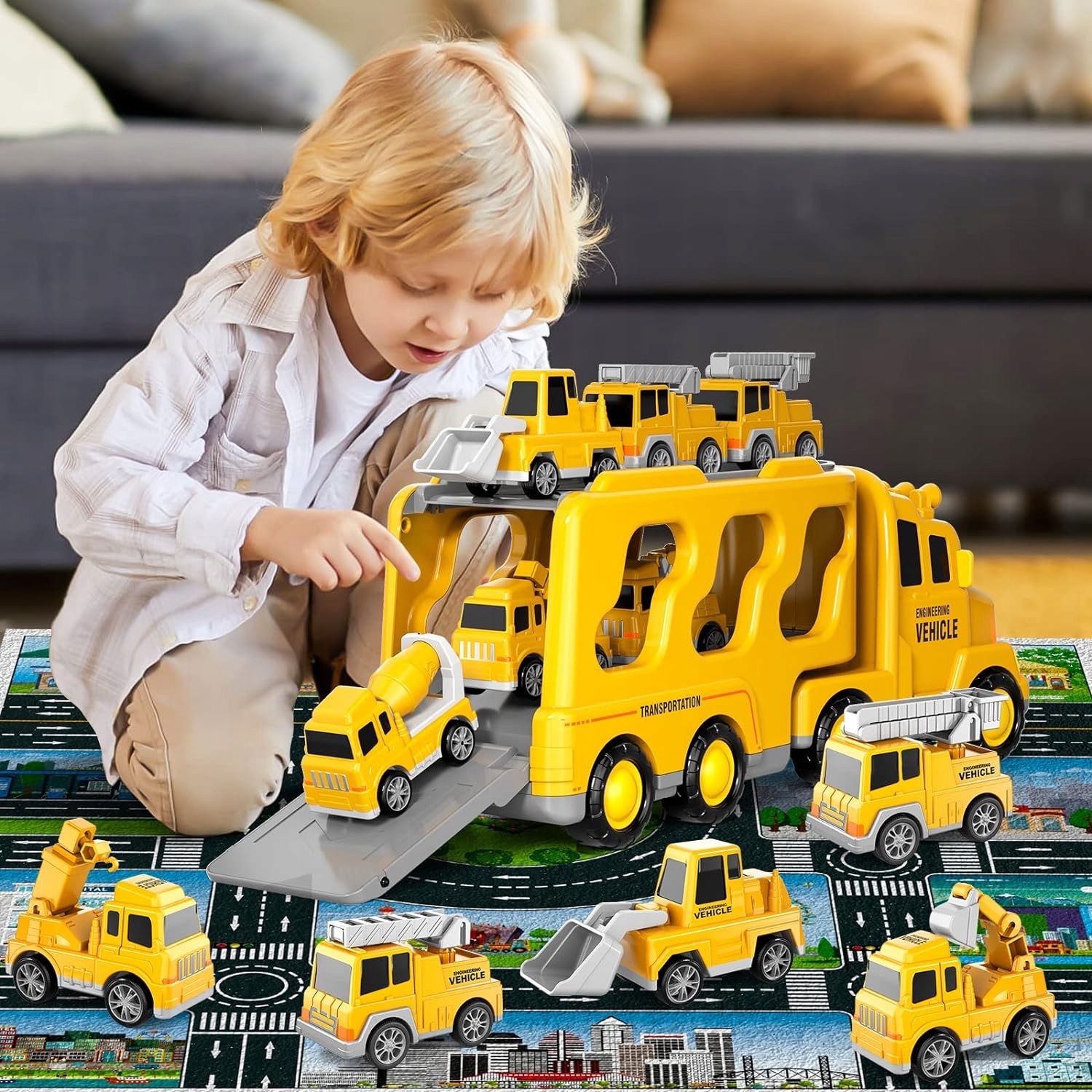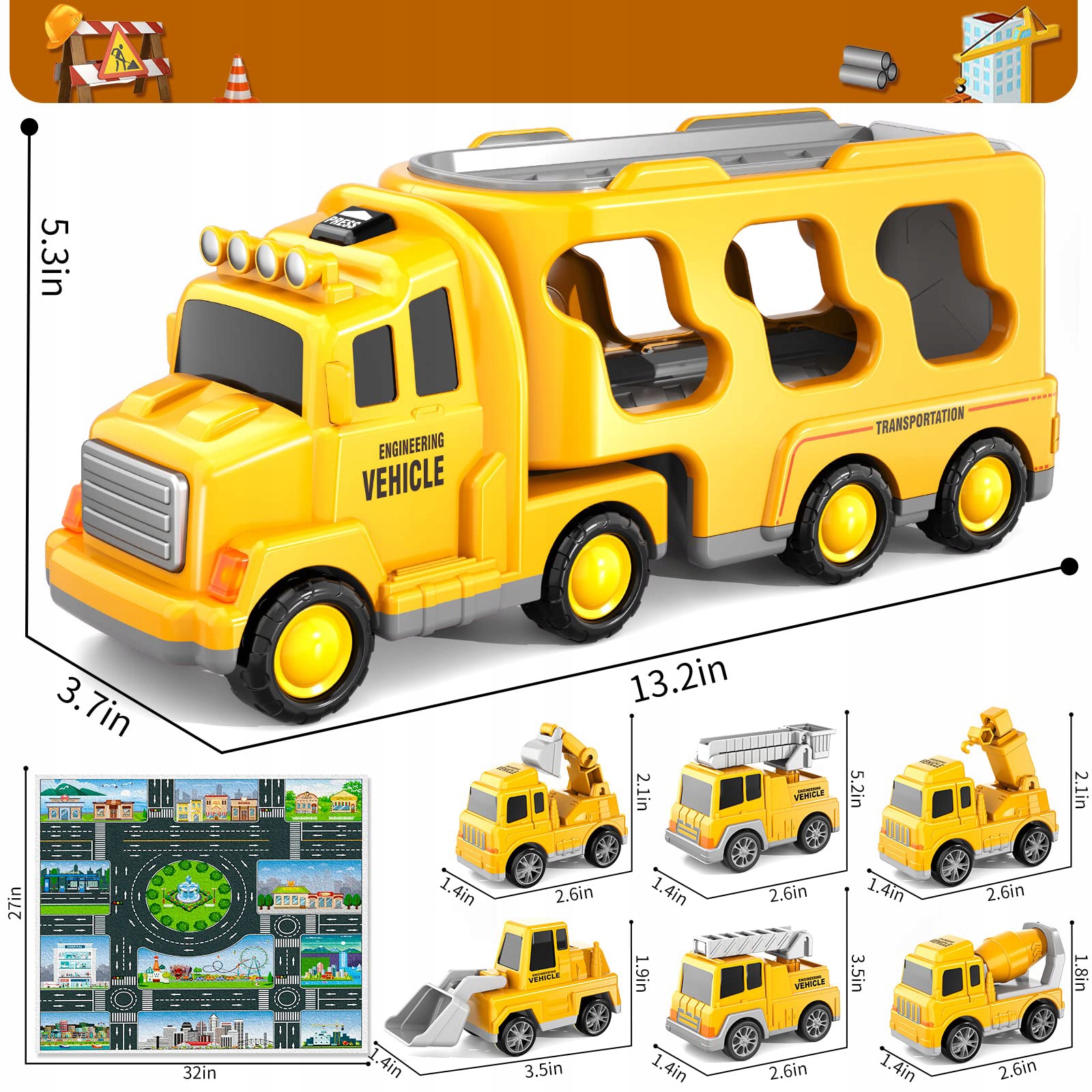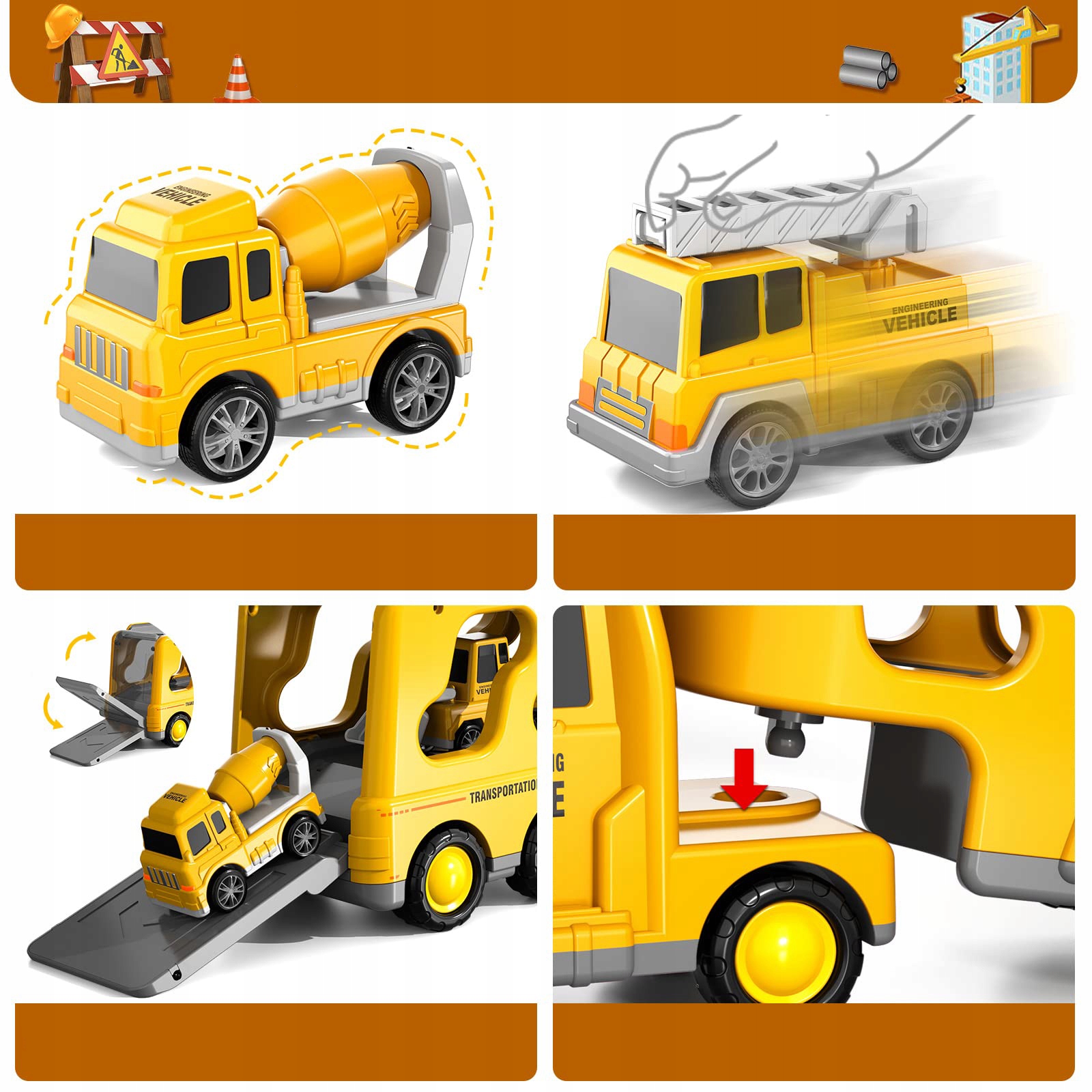 - Игрушка-грузовик-строитель-транспортер, созданная для маленьких инженеров-энтузиастов, включает в себя большой грузовик-транспортер и 6 мини-автомобилей (экскаватор, бульдозер, кран, миксер). Рабочие части этих небольших строительных машин можно перемещать, что делает их подходящими игрушками для мальчиков и девочек в возрасте от 3 до 6 лет.