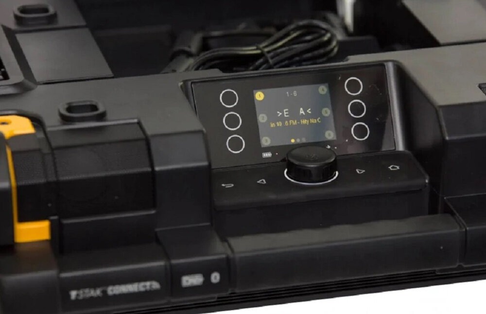 Строительная радиостанция с системой TSTAK, 6 динамиками мощностью 45 Вт и встроенным многовольтным зарядным устройством. Bluetooth, мобильное приложение, защита IP54.