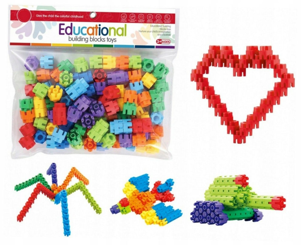 До 100 элементов 8 цветов позволяют создавать фантастические фигуры, начиная от простых, таких как прямоугольник, круг, сердце, и заканчивая немного более сложными пауком или танком. Игрушка развивает творческие способности детей, а яркие цвета кубиков побуждают создавать все более сложные конструкции. 100 элементов, 8 цветов