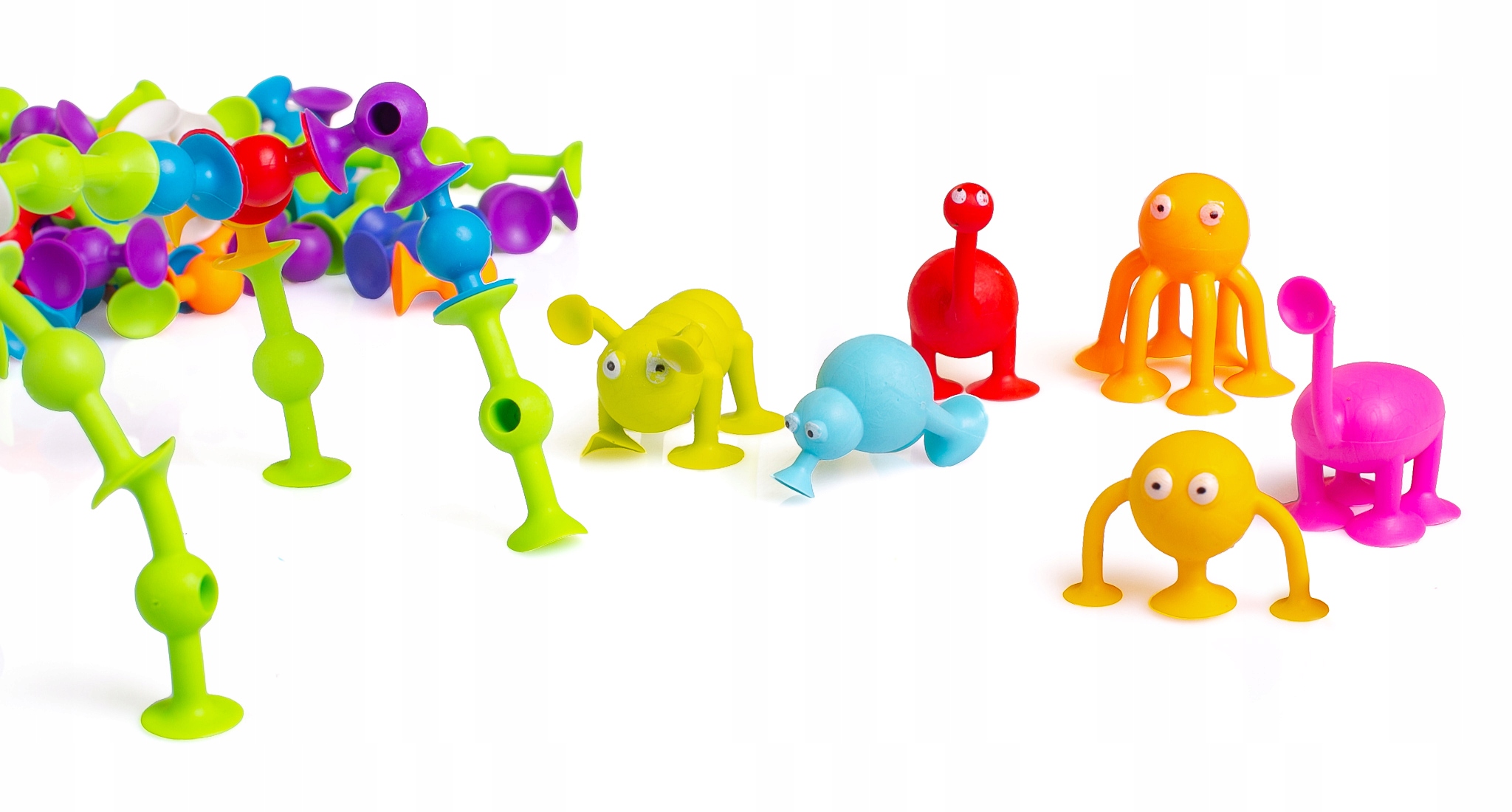 Присоски гибкие, гнутся в разные стороны и позволяют собирать любые композиции. Поэкспериментируйте и посмотрите, как забавные присоски будут развлекать вашего ребенка в ванне, в машине, за столом и где угодно :) Это очень весело, и после снятия игрушки не остается следов.