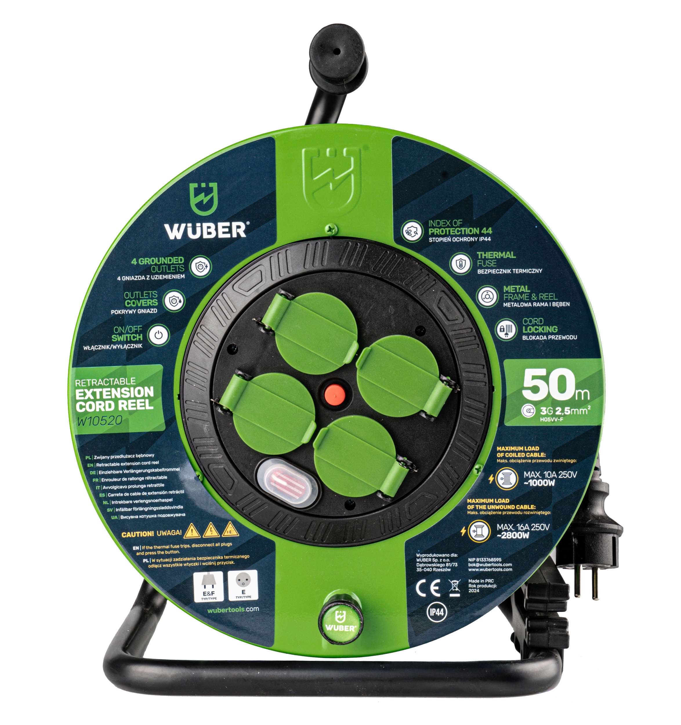 ► Металлический барабан ► 50 МЕТРОВ ► Изолированный выключатель ► Кабель 3x2,5 мм ► Тепловая защита ► Крышки розеток ► Зажим для крепления кабеля ► Уровень защиты IP44