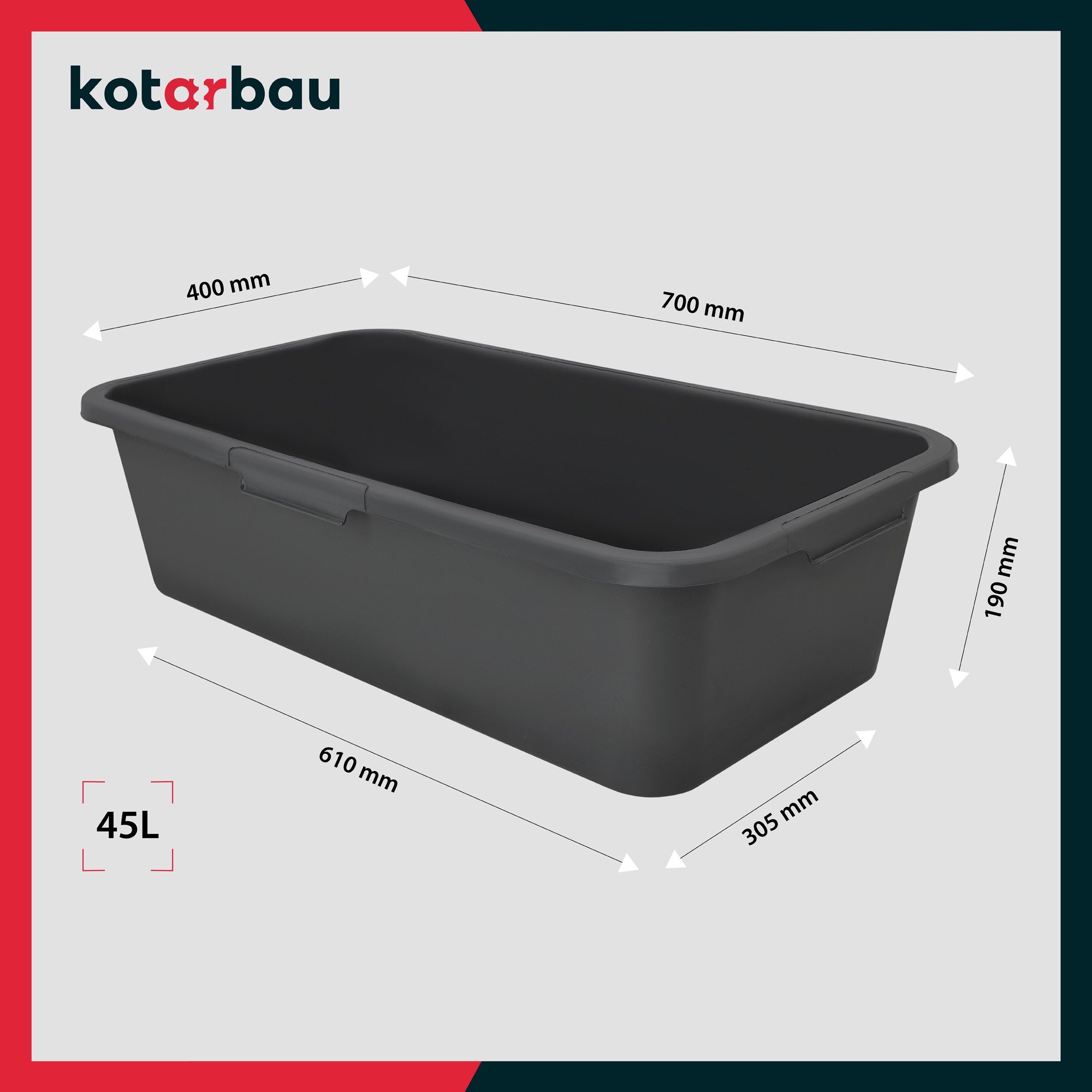 Строительный контейнер представляет собой практичную емкость емкостью 45 литров, в которой можно приготовить раствор, плиточный клей или штукатурку для штукатурки. Контейнер имеет высокие боковые стенки и изготовлен из пластика, благодаря чему материал не прилипает к чаше и его легко содержать в чистоте.