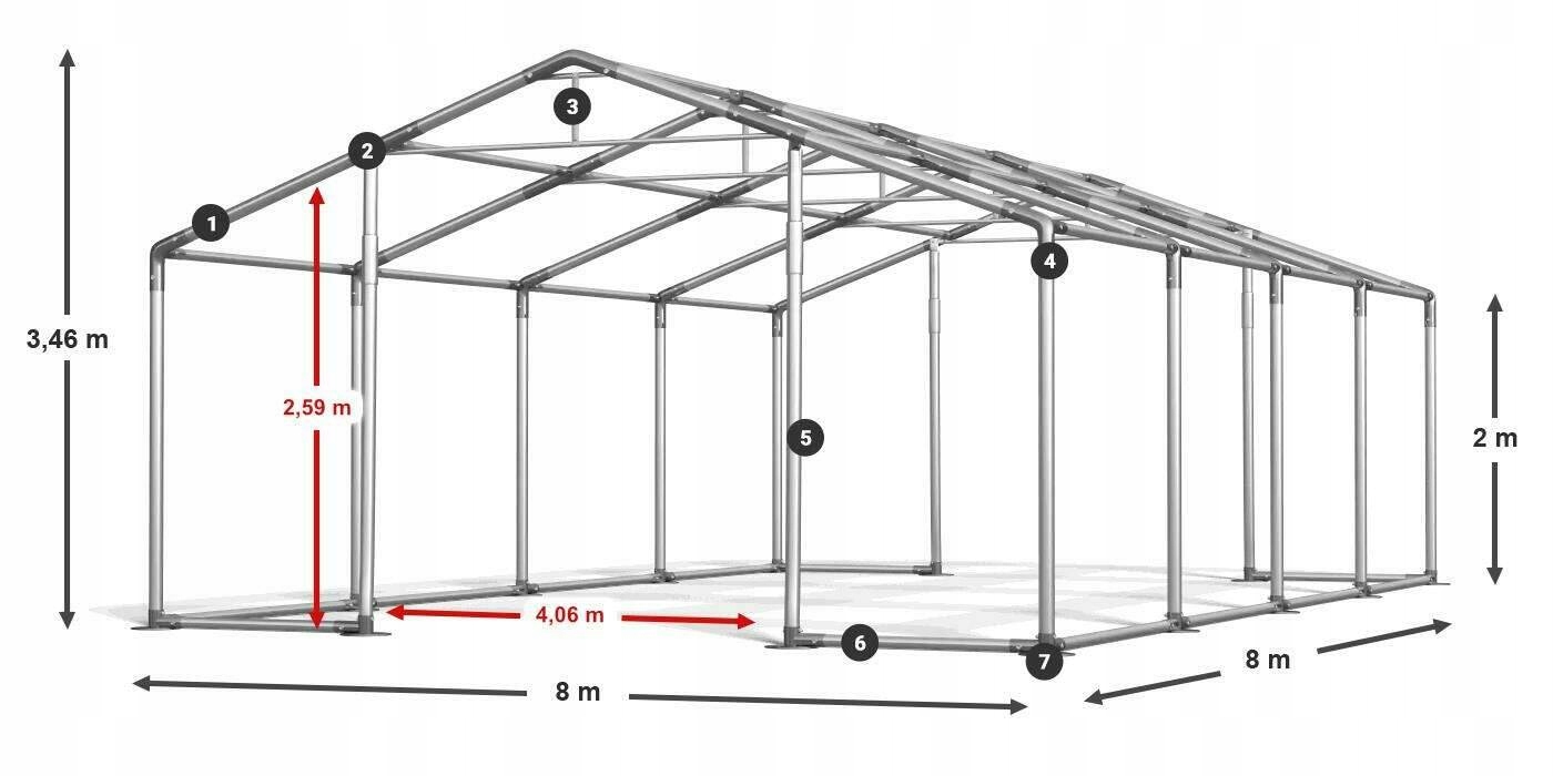 1 - Конструктивные трубы фи ок. 50 мм 2 - Структурные соединители прибл. 54 мм 3 - Усиленная конструкция крыши 4 - Прочные шурупы проходящие 5 - Усиленные входы 6 - Усиленная конструкция пола 7 - Увеличенные ножки до 14 см