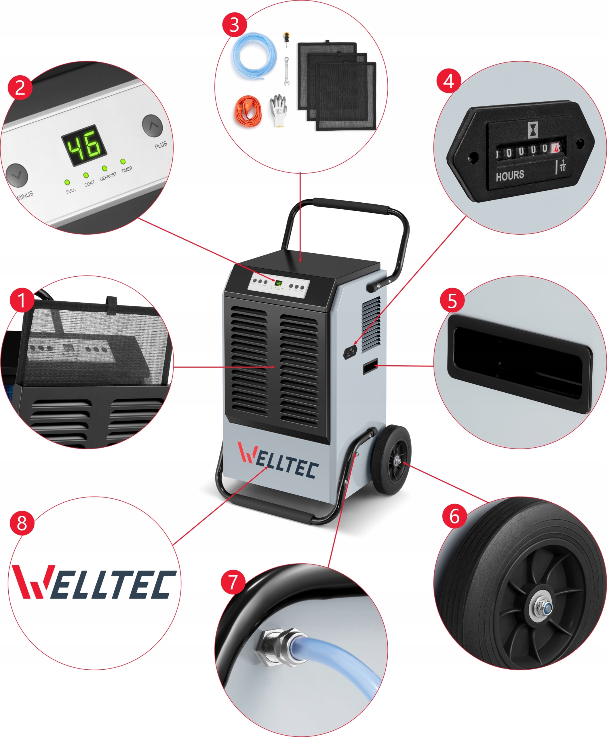 - ✔️осушка затопленных помещений - осушитель Welltec после настройки непрерывного режима работы и правильного подключения насоса для слива конденсата может работать непрерывно до полного высыхания затопленного помещения.