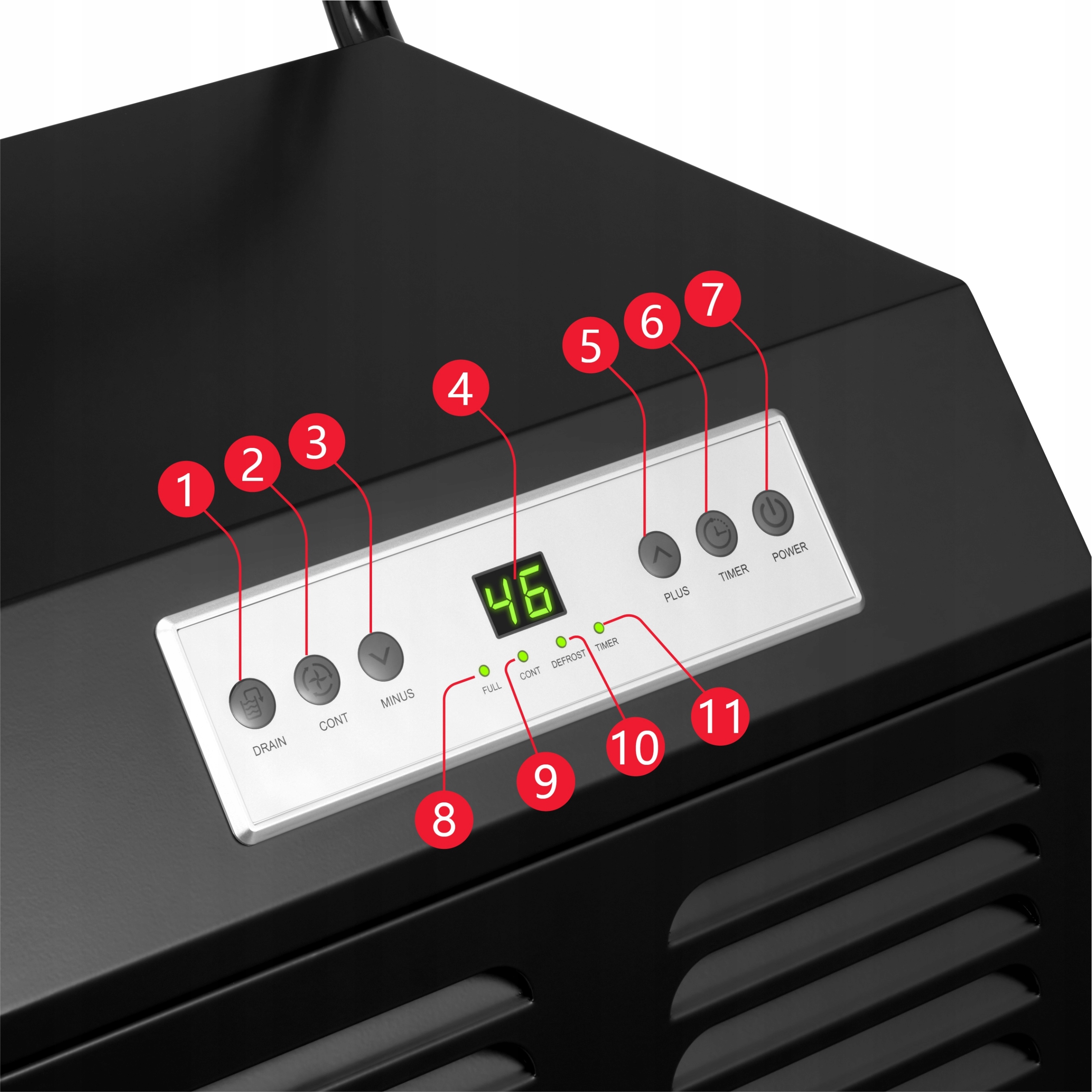 ✅ Управление осушителем DHX70 Pro осуществляется с помощью интуитивно понятной панели управления. Шесть кнопок позволяют запустить устройство, выбрать нужный уровень влажности, изменить текущий режим работы или вручную запустить конденсатный насос. Вы также можете установить 24-часовой таймер автоматического включения и выключения.