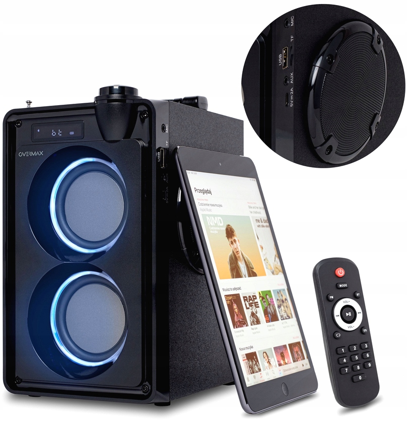 Беспроводная колонка Overmax Soundbeat 5.0 оснащенадвумя высококачественными динамиками общей среднеквадратичной мощностью 20 Вт. Динамики поддерживаются пассивными излучателями, которые добавляют глубину низким звукам, обеспечивая сильный бас.