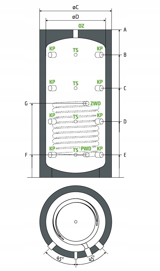 Буферный резервуар OEM BLACK емкостью 1500 литров, со змеевиком 3,5 м2 и изоляцией