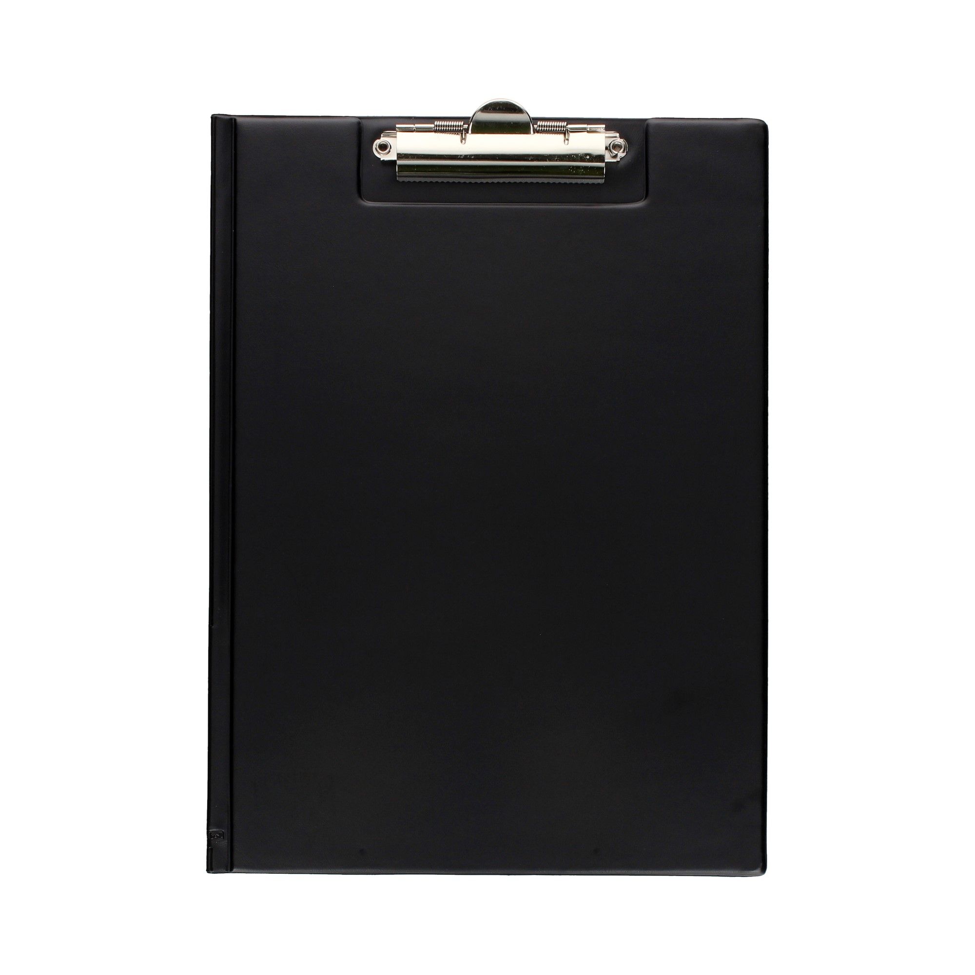ПВХ-пленка, картонно-уплотненный центр, пружинный прижимной механизм для удержания листов бумаги, карман на внутренней стороне обложки и подставка для ручек, формат А4, черный