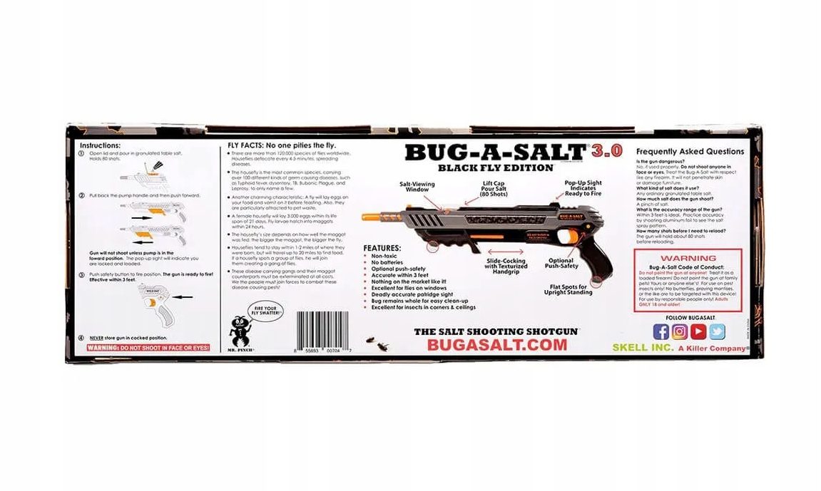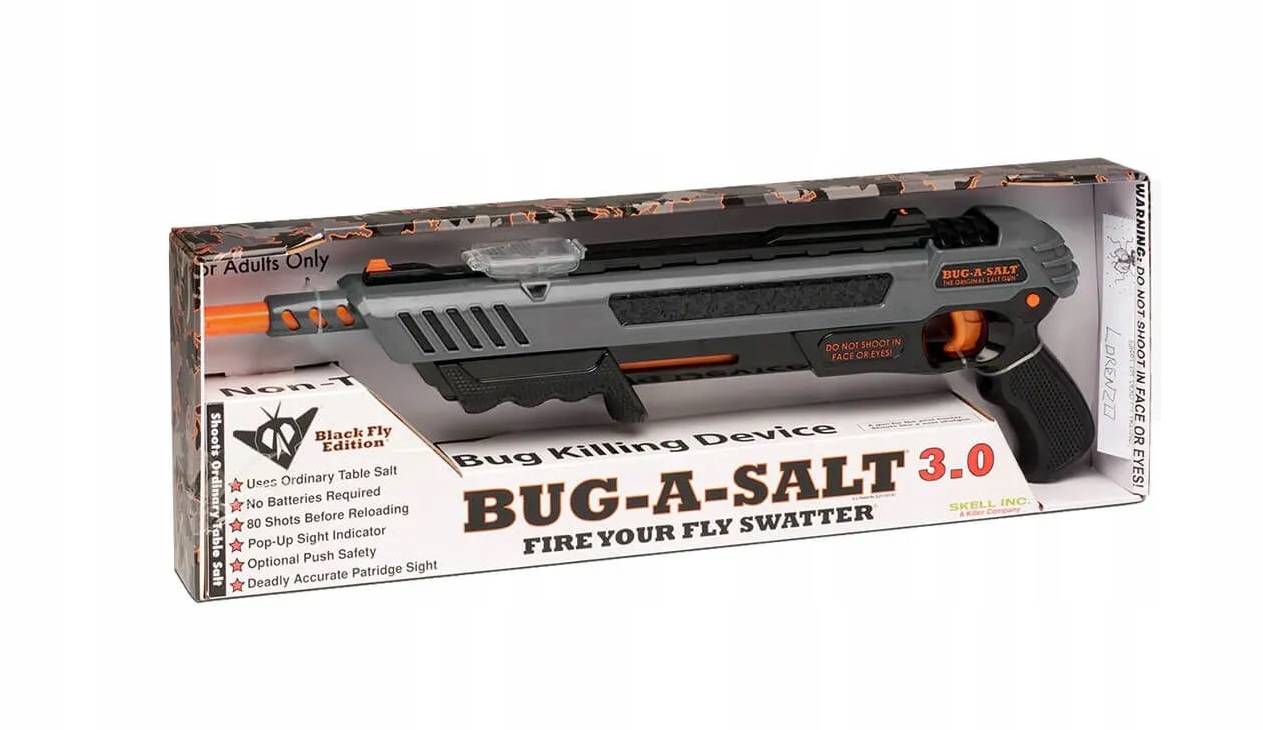 Этот соляный пистолет Bug-a-Salt Black Fly 3.0 абсолютно не нужен для борьбы с мухами, но это делает его намного приятнее! Bug-A-Salt имеет тактический вид и может использоваться для борьбы с вредителями (мухи, комары, пауки и другие), стреляя в них. Это можно сделать, выстрелив их близко, но это гораздо приятно сделать, стреляя на расстоянии. Соленый пистолет Black Fly 3.0 имеет более сильную пружину, чем его предшественник, что означает, что вы можете стрелять в соль дальше и быстрее. Это означает, что вы можете снимать вредителей с большего расстояния