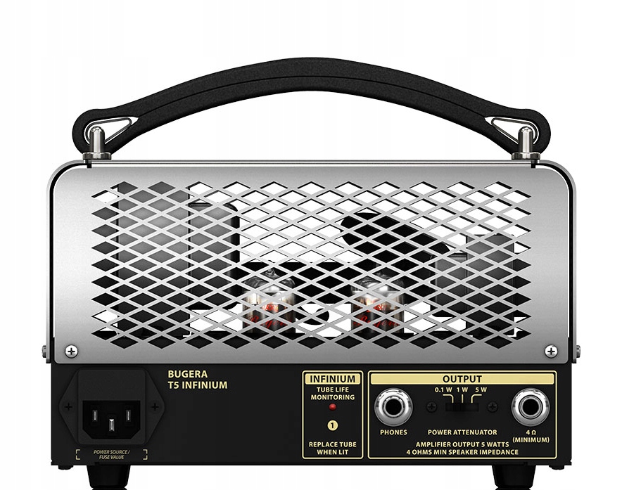 Bugera T5 INFINIUM — ламповый усилитель мощностью 5 Вт, основанный на революционной технологии, которая позволяет продлить срок службы ламп в двадцать раз за счет равномерного распределения нагрузки между ними, а также позволяет заменять их без необходимости их сопряжения. Смещение выставляется автоматически, что обеспечивает потрясающий звук даже при небольшой мощности и громкости.