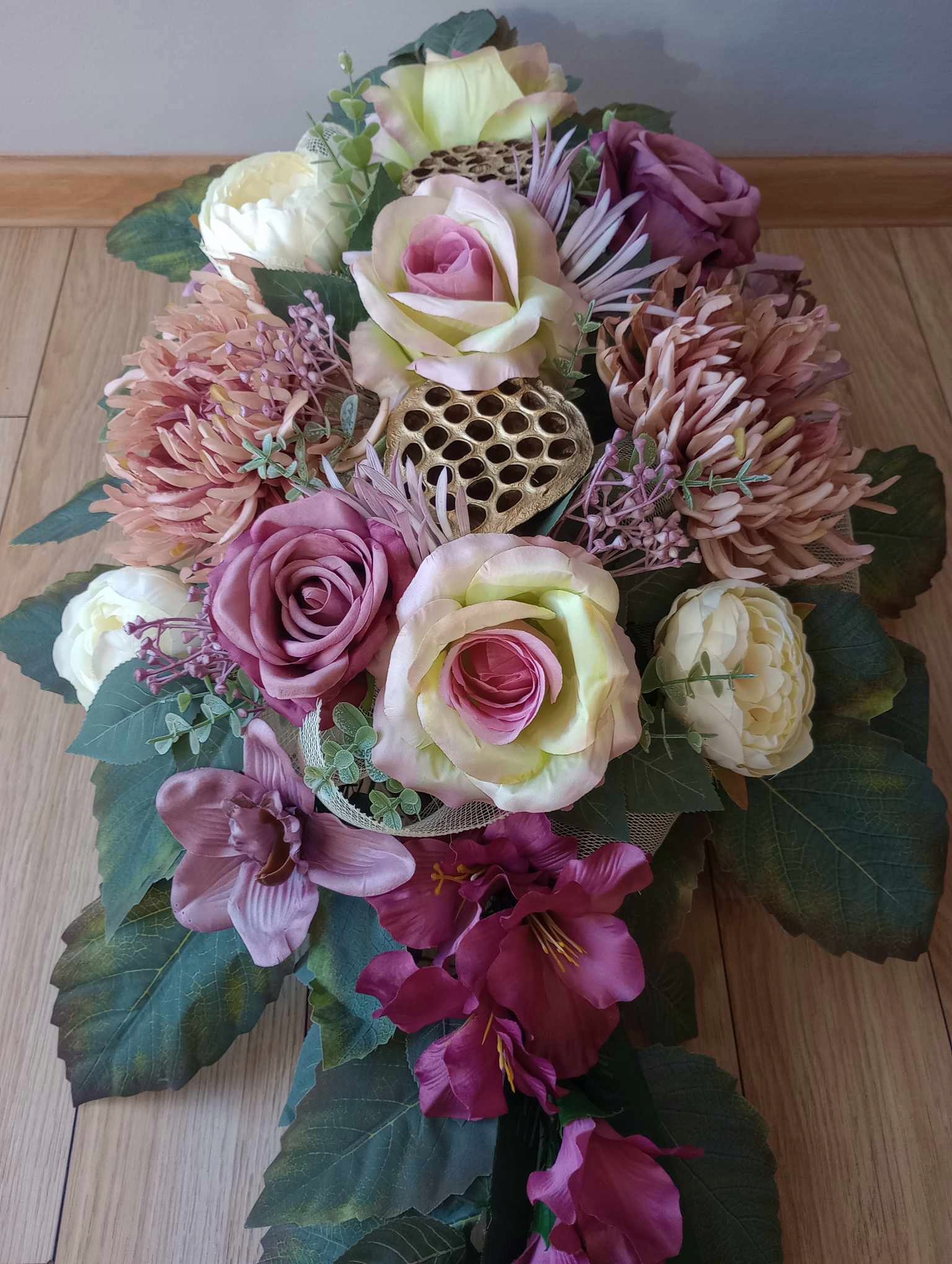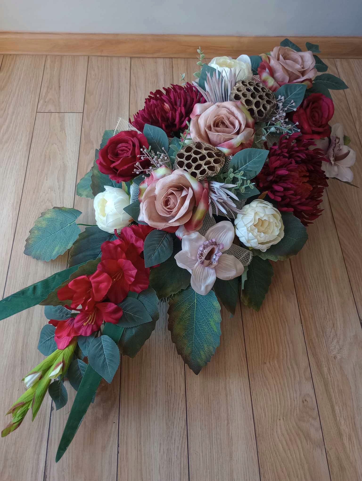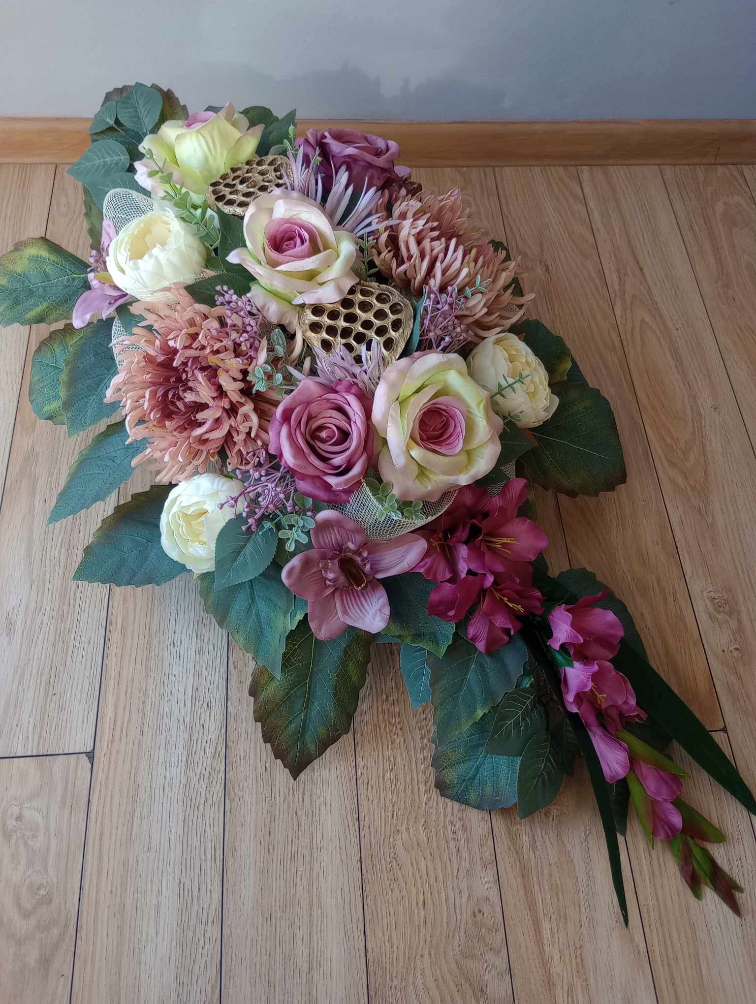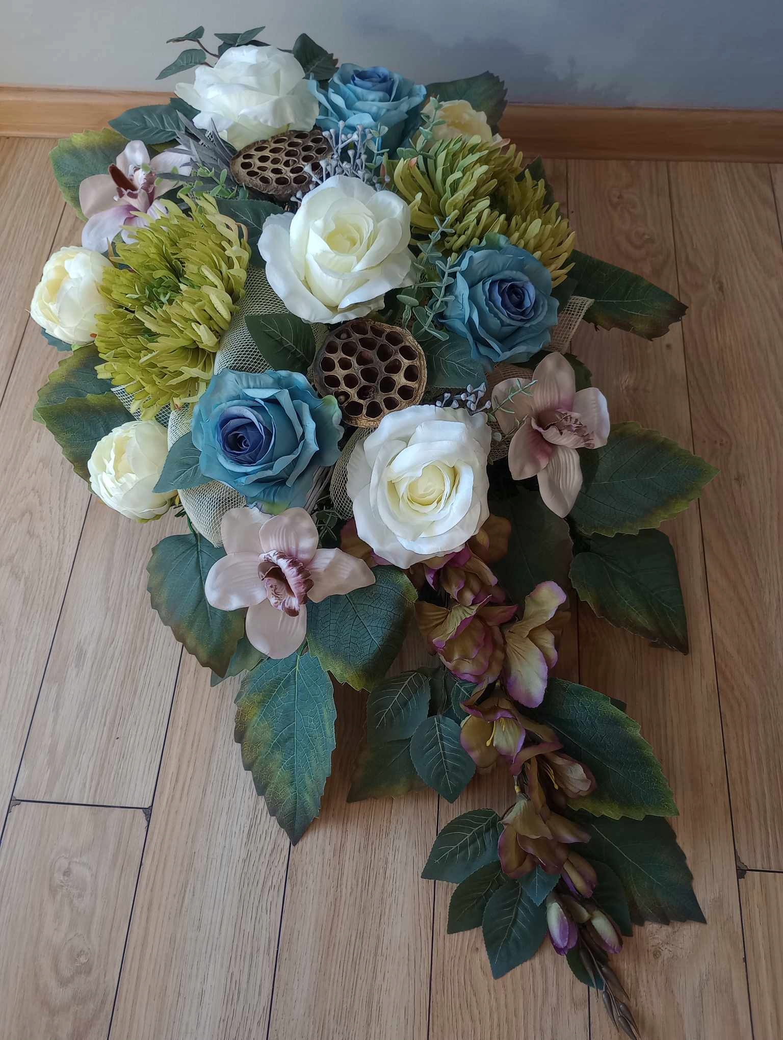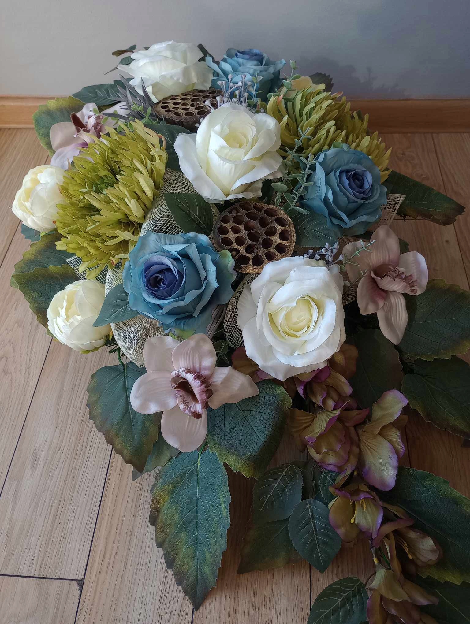 Искусственная композиция (т. н. украшение, икебана) на помещается на надгробие в пластиковом горшке, составляет ок. Длина 80 см и ширина 50 см.