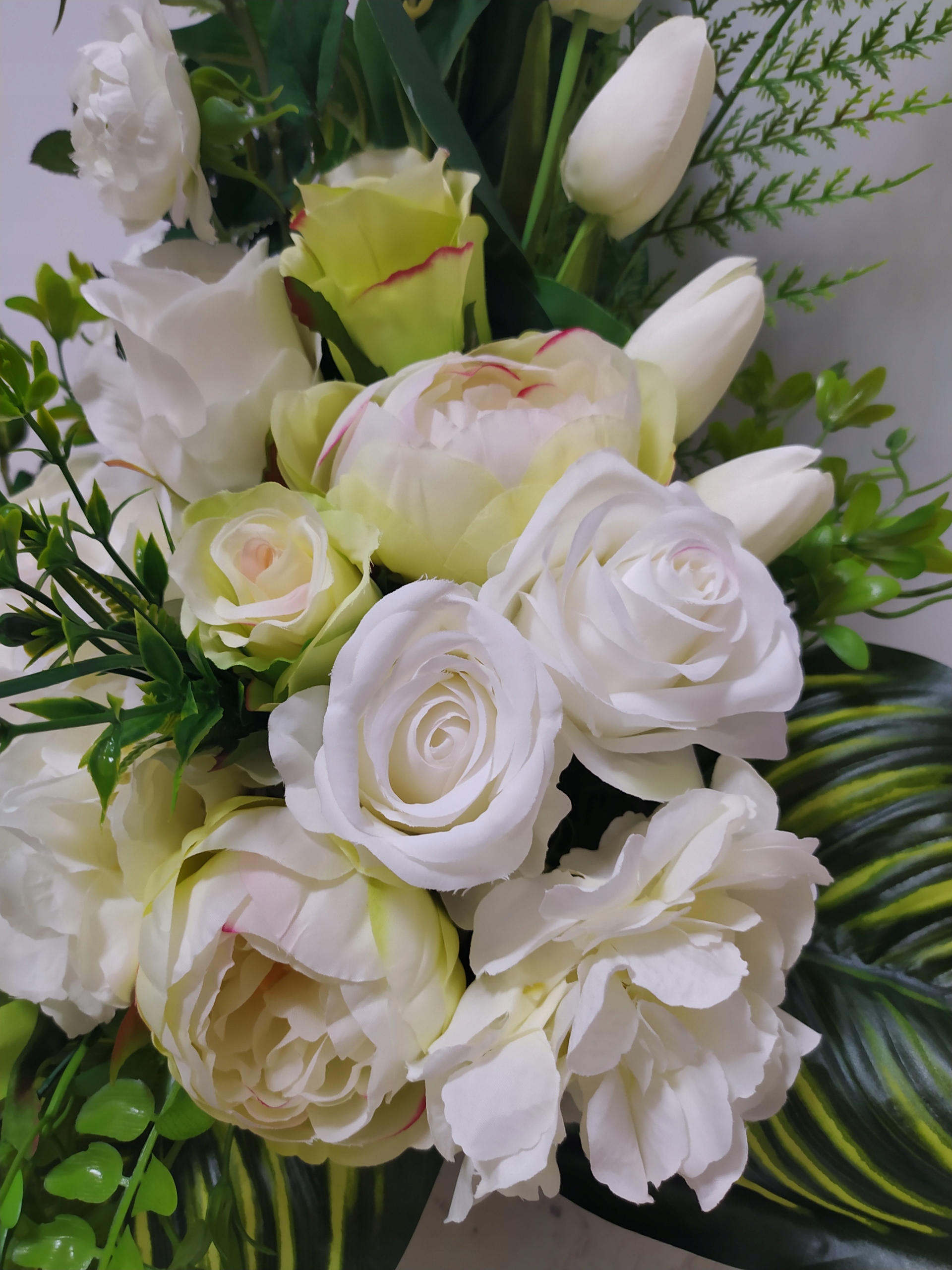 Красивый стоячий (вытянутый) букет на могилу из искусственных цветов. Мы сами тщательно составляем наши композиции, благодаря чему украшения уникальны и в жизни смотрятся еще лучше.