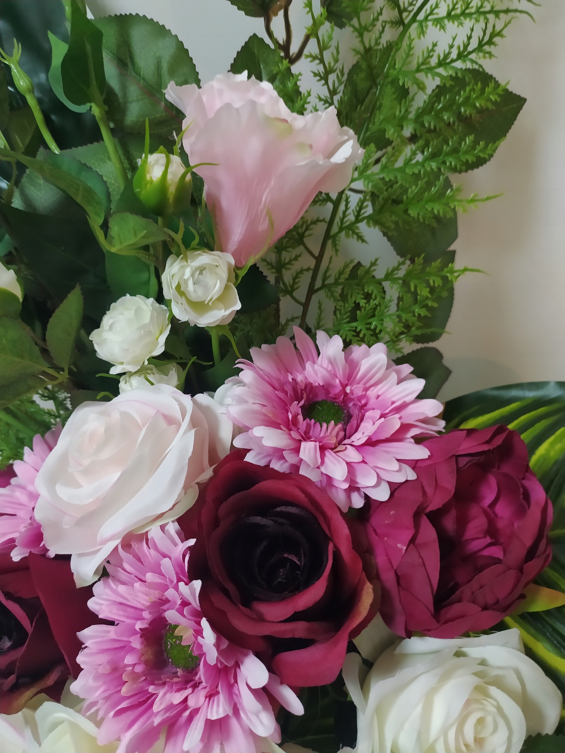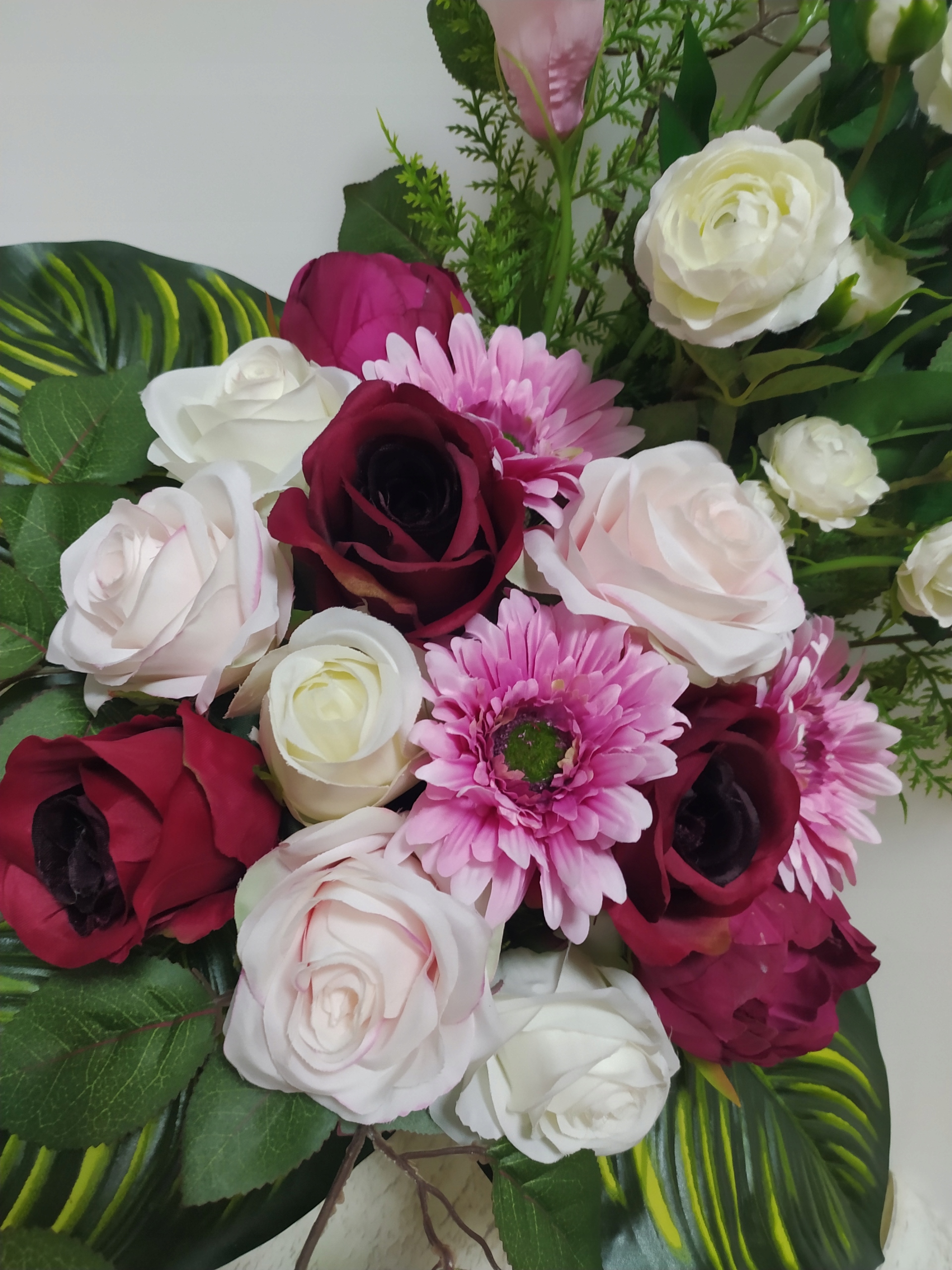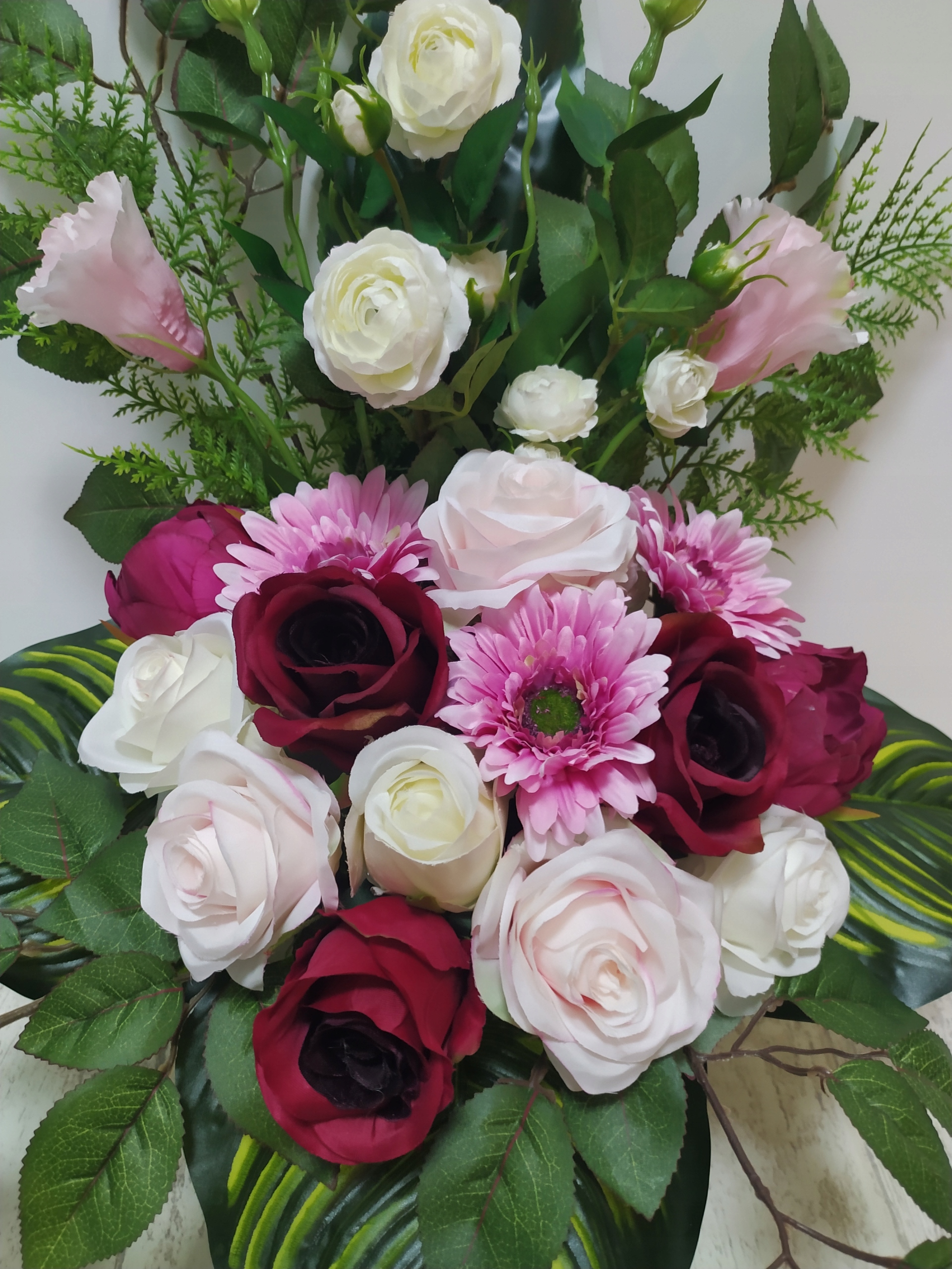 Красивый стоячий (вытянутый) букет на могилу из искусственных цветов. Мы сами тщательно составляем наши композиции, благодаря чему украшения уникальны и в жизни смотрятся еще лучше.