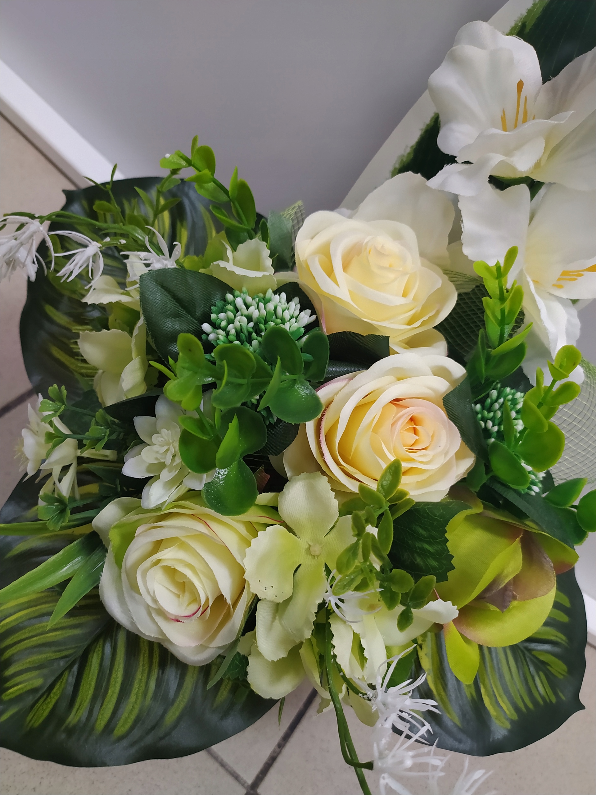 Красивый стоячий (вытянутый) букет на могилу из искусственных цветов. Мы сами тщательно составляем наши композиции, благодаря чему украшения уникальны и в жизни смотрятся еще лучше.