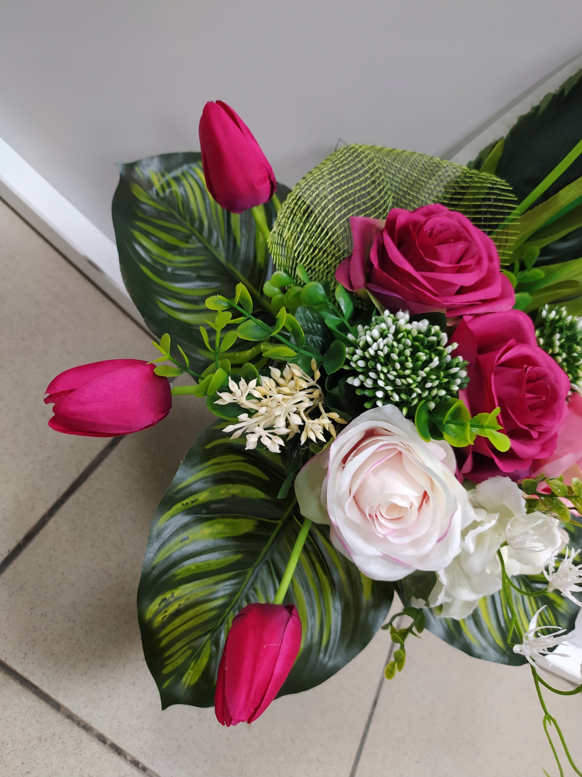 Красивый стоячий (вытянутый) букет на могилу из искусственных цветов. Мы сами тщательно составляем наши композиции, благодаря чему украшения уникальны и в жизни смотрятся еще лучше.