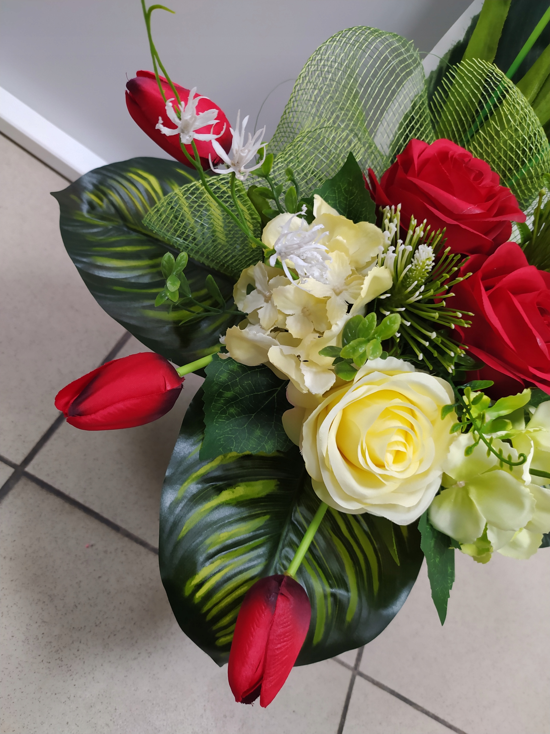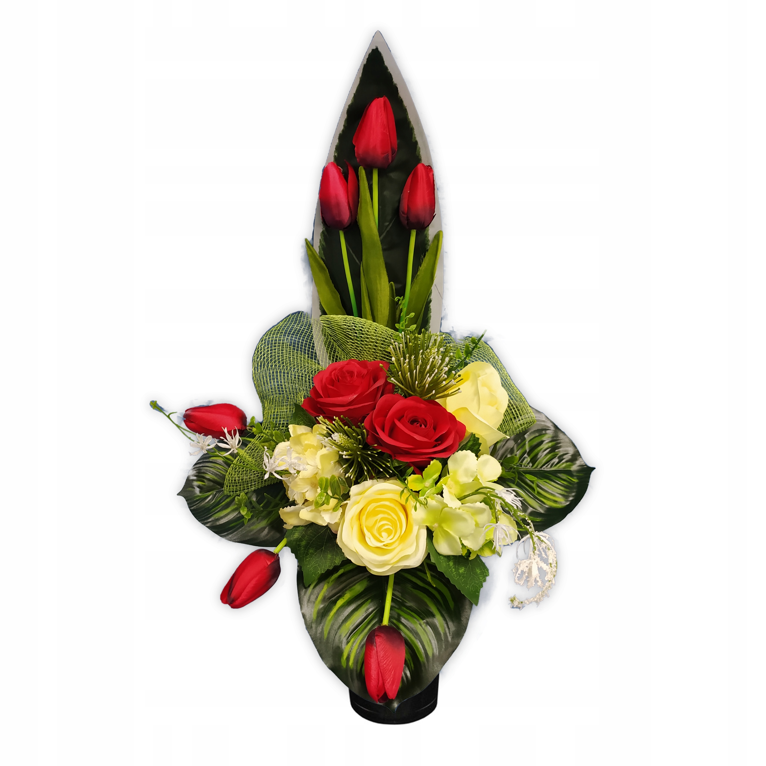 Красивый стоячий (вытянутый) букет на могилу из искусственных цветов. Мы сами тщательно составляем наши композиции, благодаря чему украшения уникальны и в жизни смотрятся еще лучше.