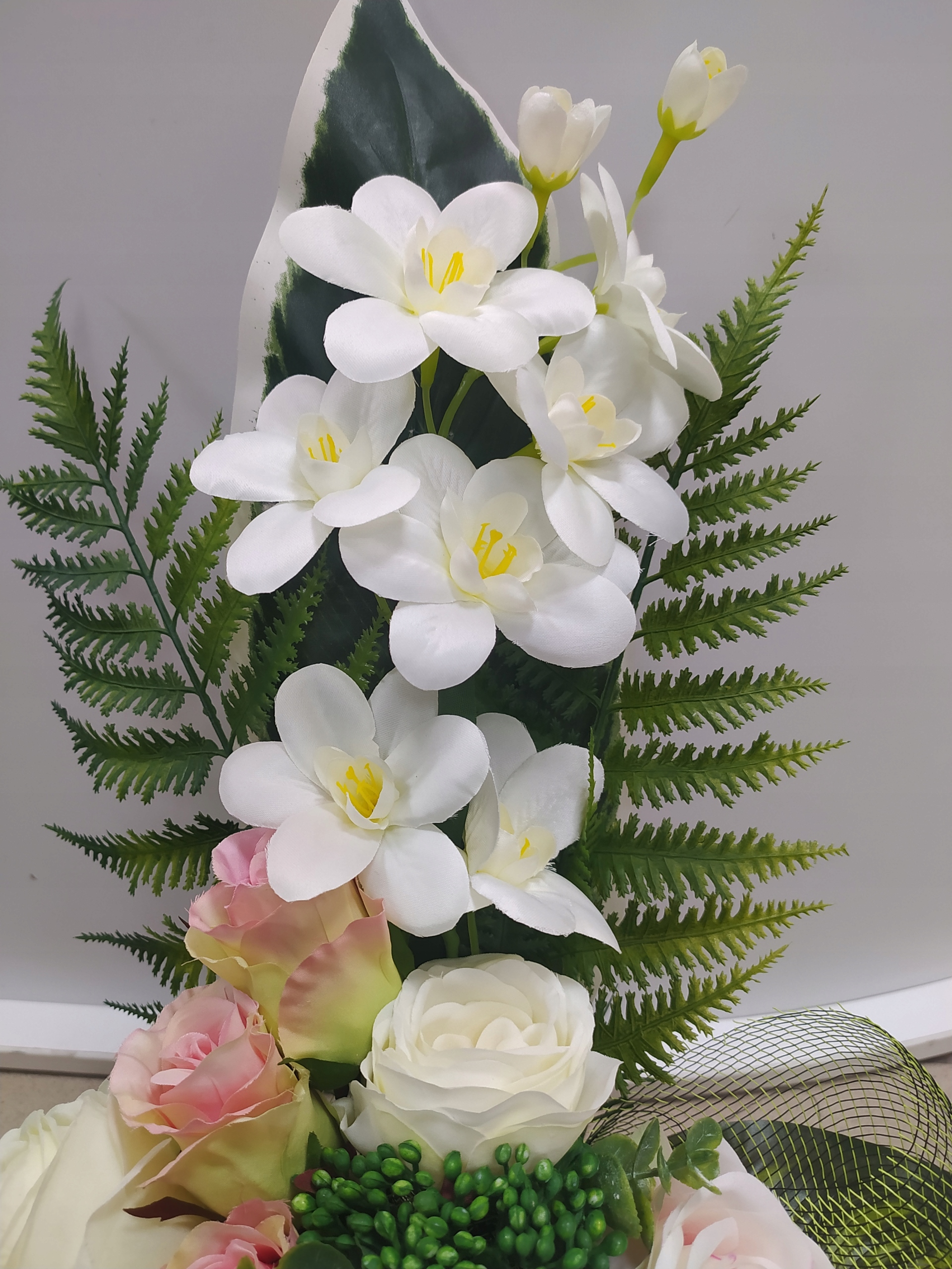 Красивый стоячий (вытянутый) букет на могилу из искусственных цветов. Мы сами тщательно составляем наши композиции, благодаря чему украшения уникальны и в жизни смотрятся еще лучше.