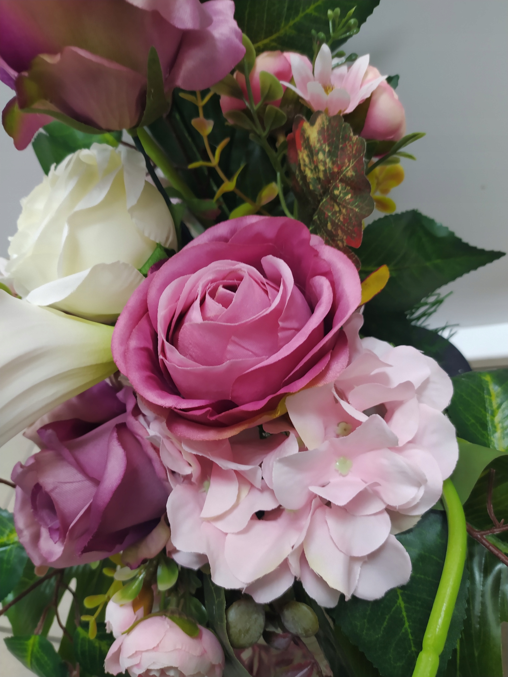 Красивый стоячий (вытянутый) букет на могилу из искусственных цветов. Мы сами тщательно составляем наши композиции, благодаря чему украшения уникальны и в жизни смотрятся еще лучше.