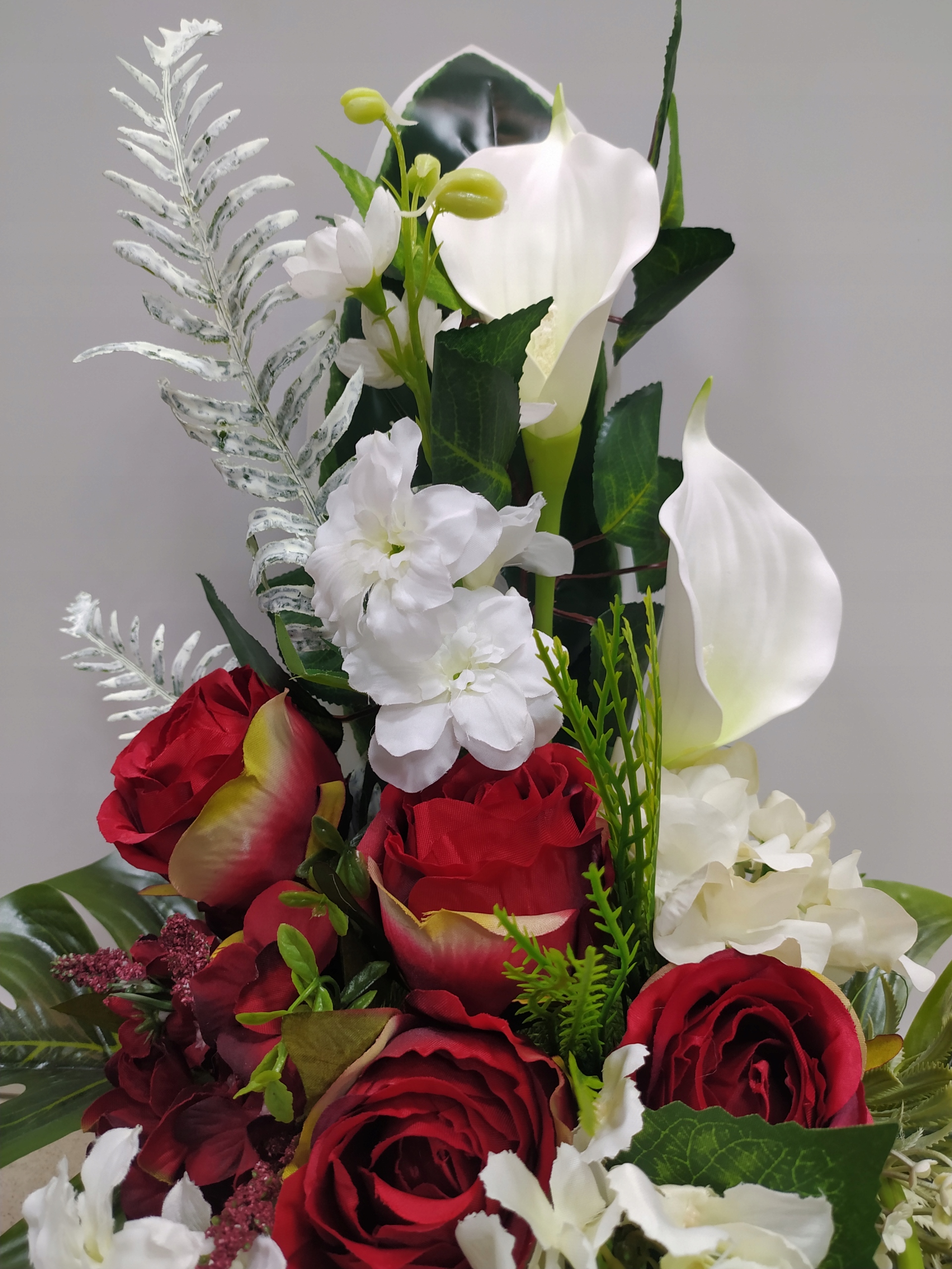 Красивый стоячий (вытянутый) букет на могилу из искусственных цветов. Мы сами тщательно составляем наши композиции, благодаря чему украшения уникальны и в жизни смотрятся еще лучше.