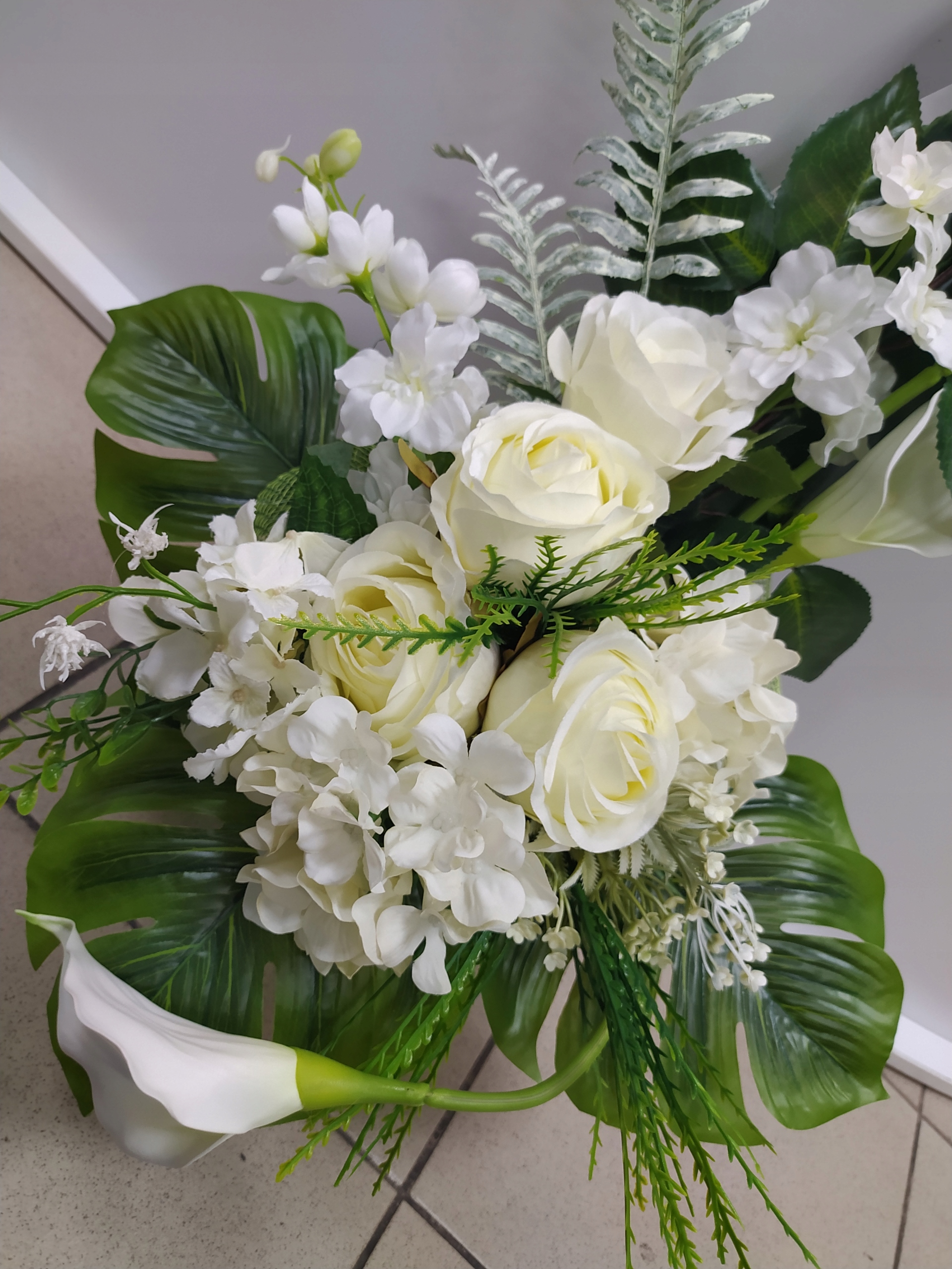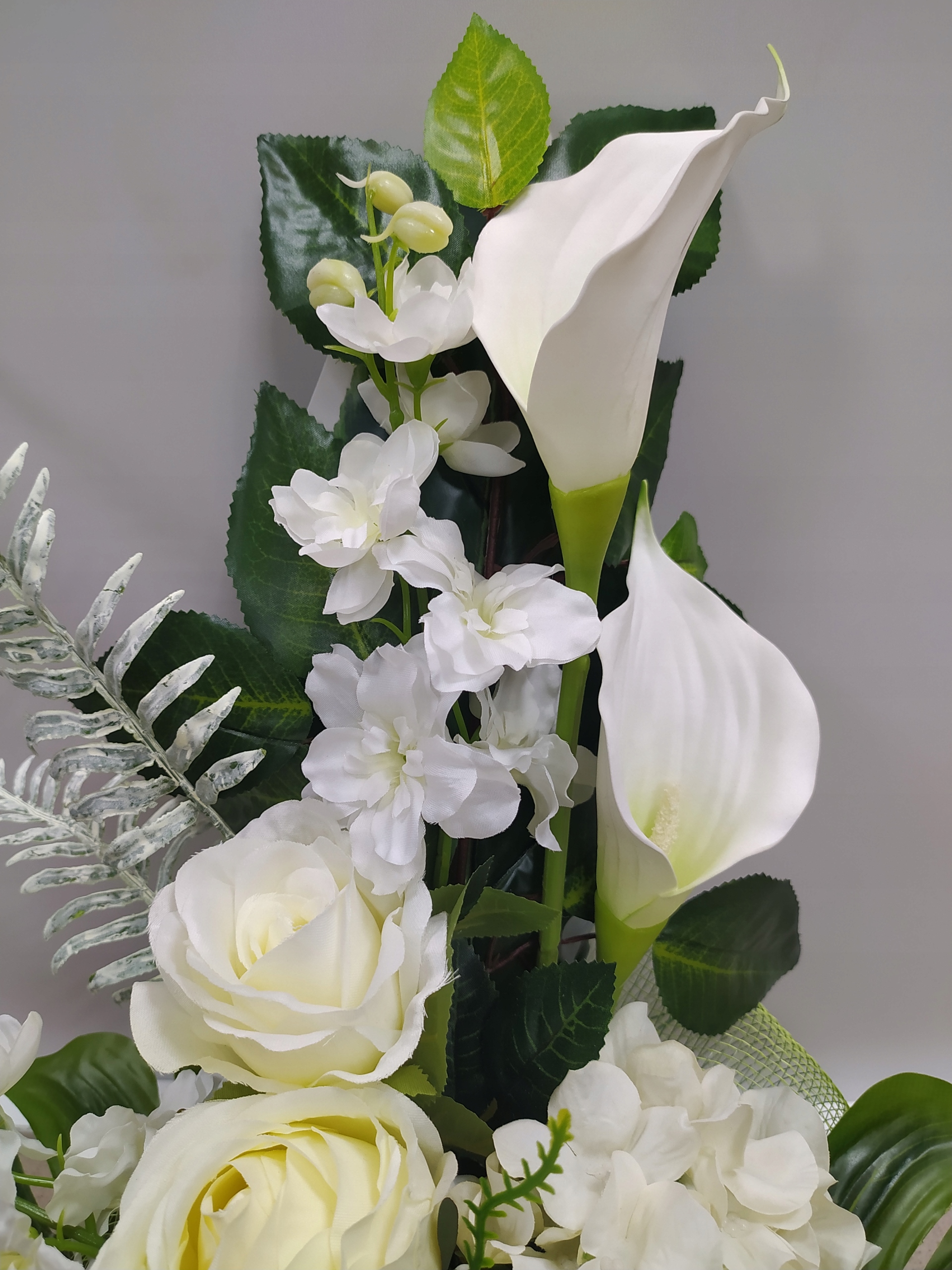 Красивый стоячий (вытянутый) букет на могилу из искусственных цветов. Мы сами тщательно составляем наши композиции, благодаря чему украшения уникальны и в жизни смотрятся еще лучше.