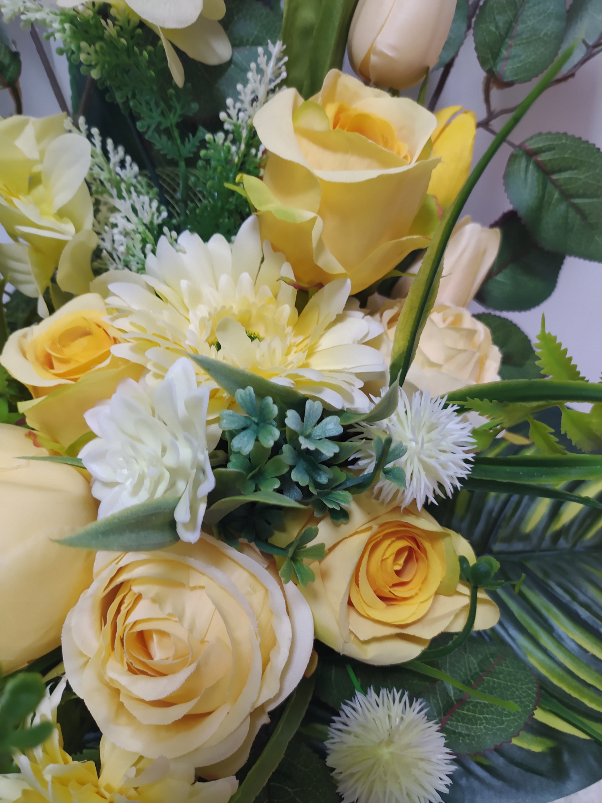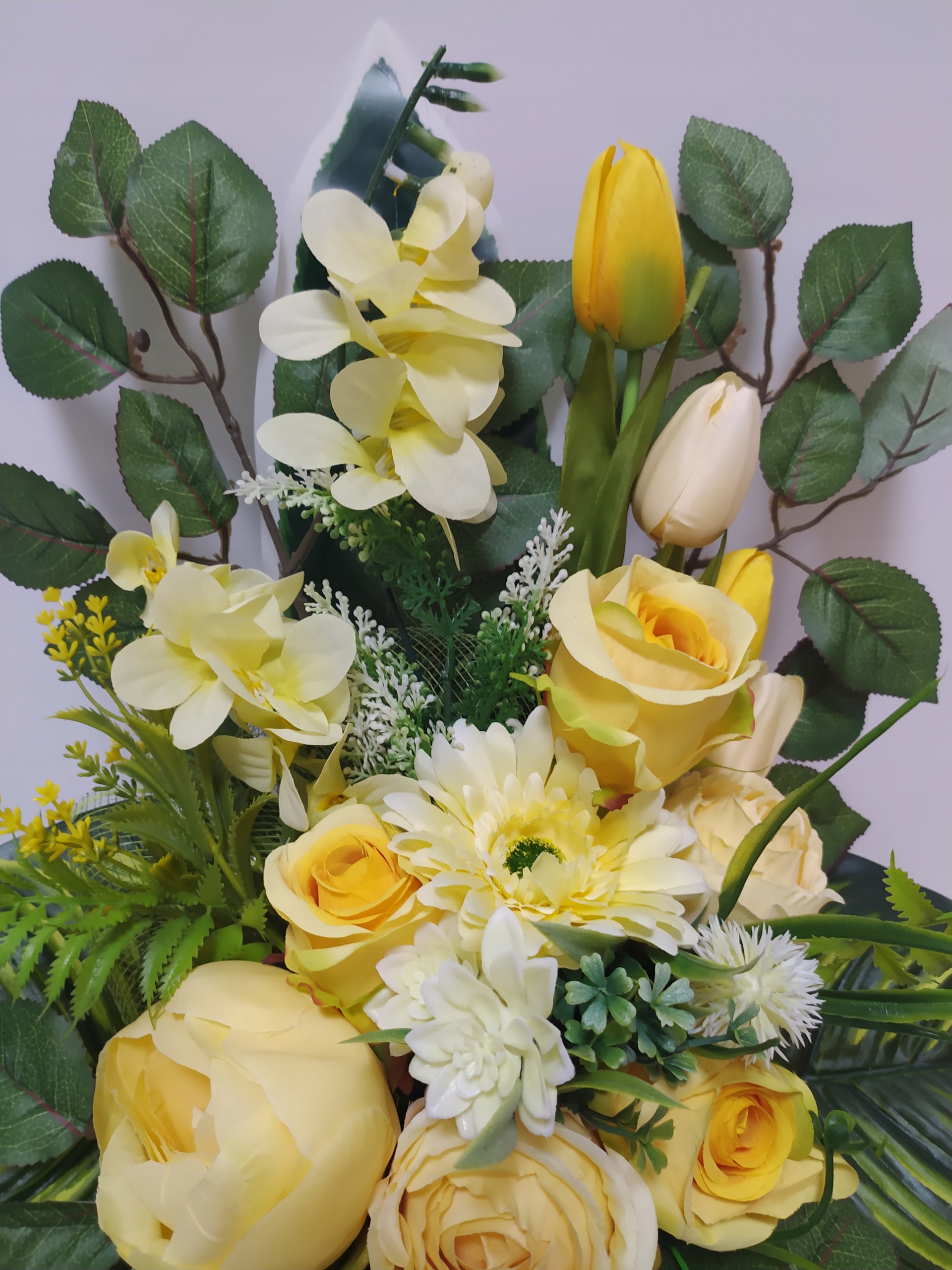 Красивый стоячий (вытянутый) букет на могилу из искусственных цветов. Мы сами тщательно составляем наши композиции, благодаря чему украшения уникальны и в жизни смотрятся еще лучше.