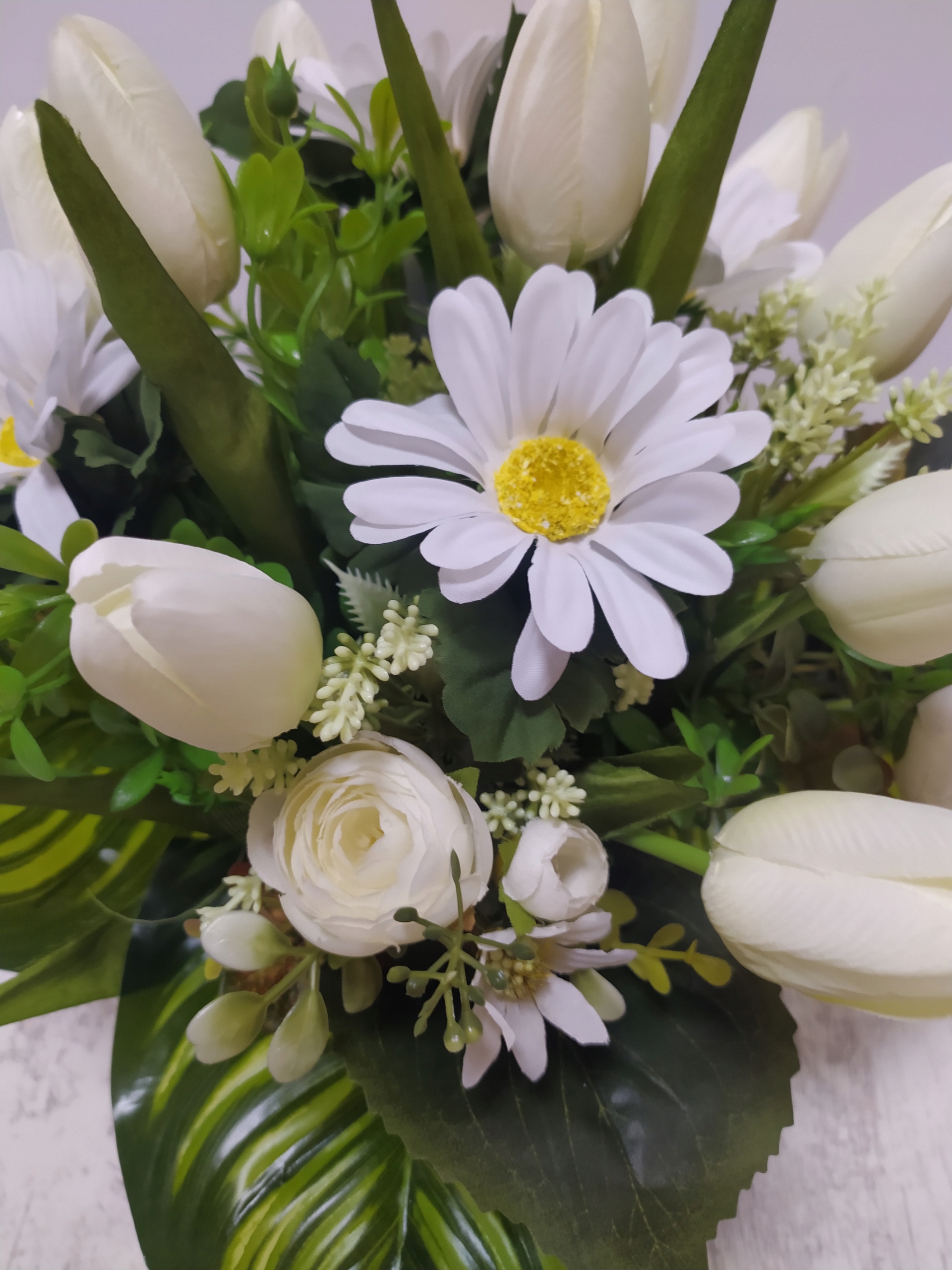 Красивый круглый могильный букет из искусственных цветов. Мы сами тщательно составляем наши композиции, благодаря чему украшения уникальны и в жизни смотрятся еще лучше.