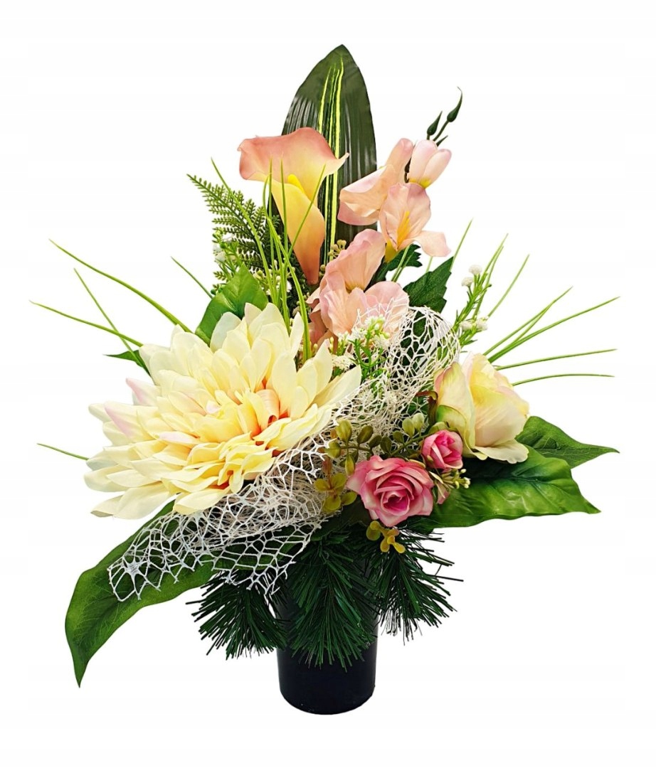 В украшениях представлена уникальная композиция из искусственных цветов. Тщательно подобранные цветы чрезвычайно реалистичны, придают букету аутентичность и подчеркивают его торжественный характер.Это изделие идеально подходит в качестве элемента украшения могилы, сочетая уважение и элегантность в одном тщательно продуманном дизайне.
