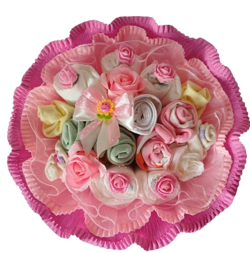 Букет изготовлен из одежды, импортируемой с компаниями США George или F & F> из деликатного, хорошего хлопка, 5 кусочков подгузников Pampers Premium и тонких искусственных роз.