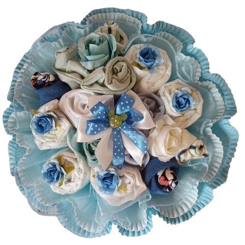 Букет изготовлен из одежды, импортируемой с компаниями США George или F & F> из деликатного, хорошего хлопка, 5 кусочков подгузников Pampers Premium и тонких искусственных роз.