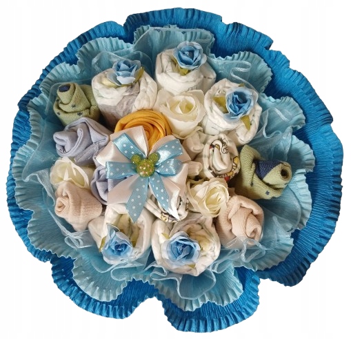 Букет изготовлен из одежды, импортируемой с компаниями США George или F & F> из деликатного, хорошего хлопка, 5 кусочков подгузников Pampers Premium и тонких искусственных роз.