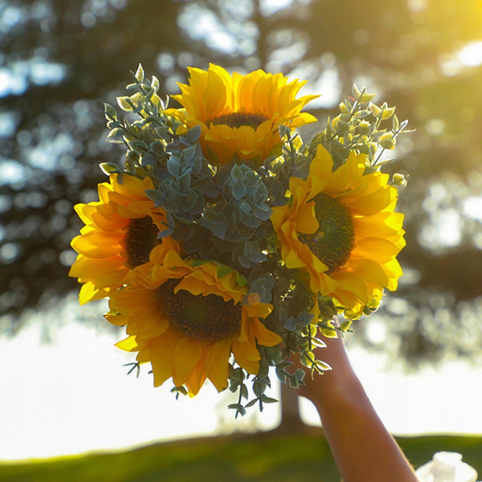 [красиво]: искусственные букеты в ярких цветах. Этот букет содержит подсолнухи и листья эвкалипта, которые создают романтическую и деревенскую атмосферу.