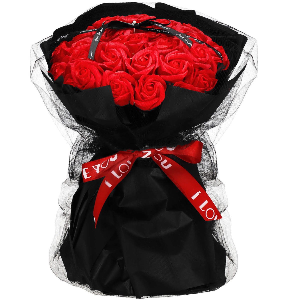 - Тип: букет красных мыльных роз в черной декоративной бумаге, обернутый тюлем.