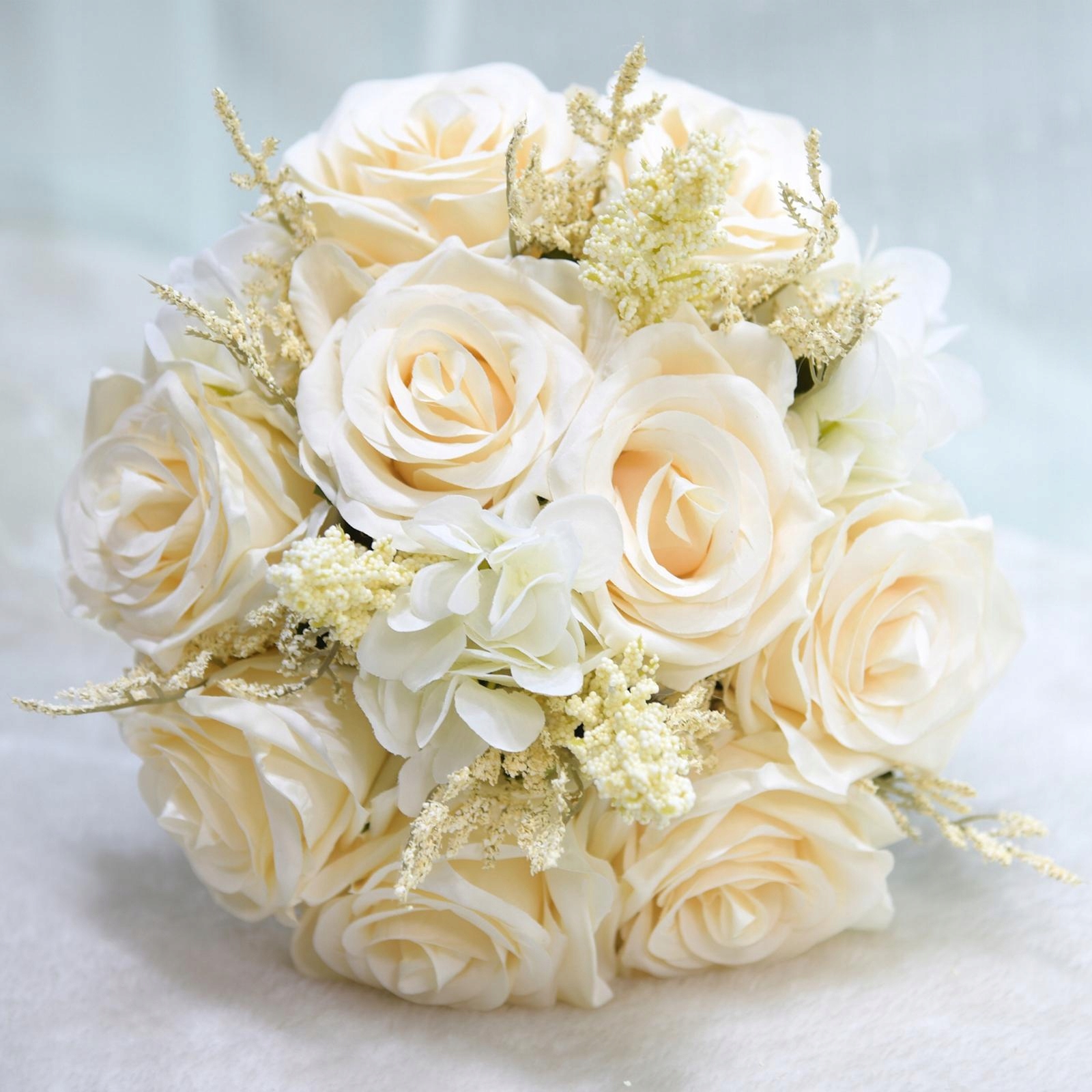 Шелковой цветочный материал: Свадебный букет изготовлен из шелкового цветочного материала, высокого насыщения, без затухания и легкого ухода.
