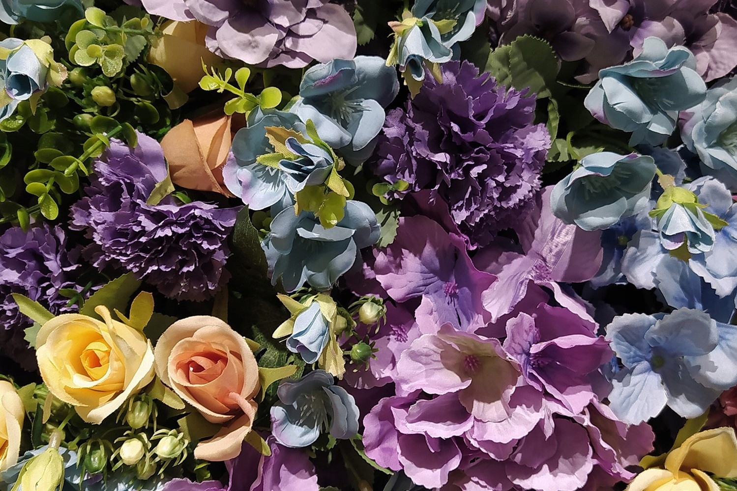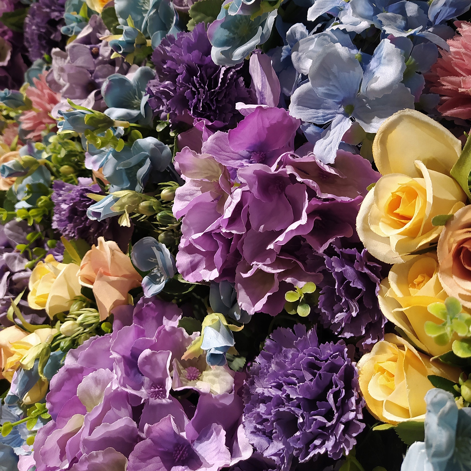 Композиция Flower Fusion – это настоящий заряжающий энергией луг. Такое украшение обязательно привнесет в ваше пространство дыхание весны. Композиция включает в себя множество различных, ярких видов цветов - от маленьких кремовых и чайных роз, ярких гвоздик и горошка до красивых синих и фиолетовых гортензий.