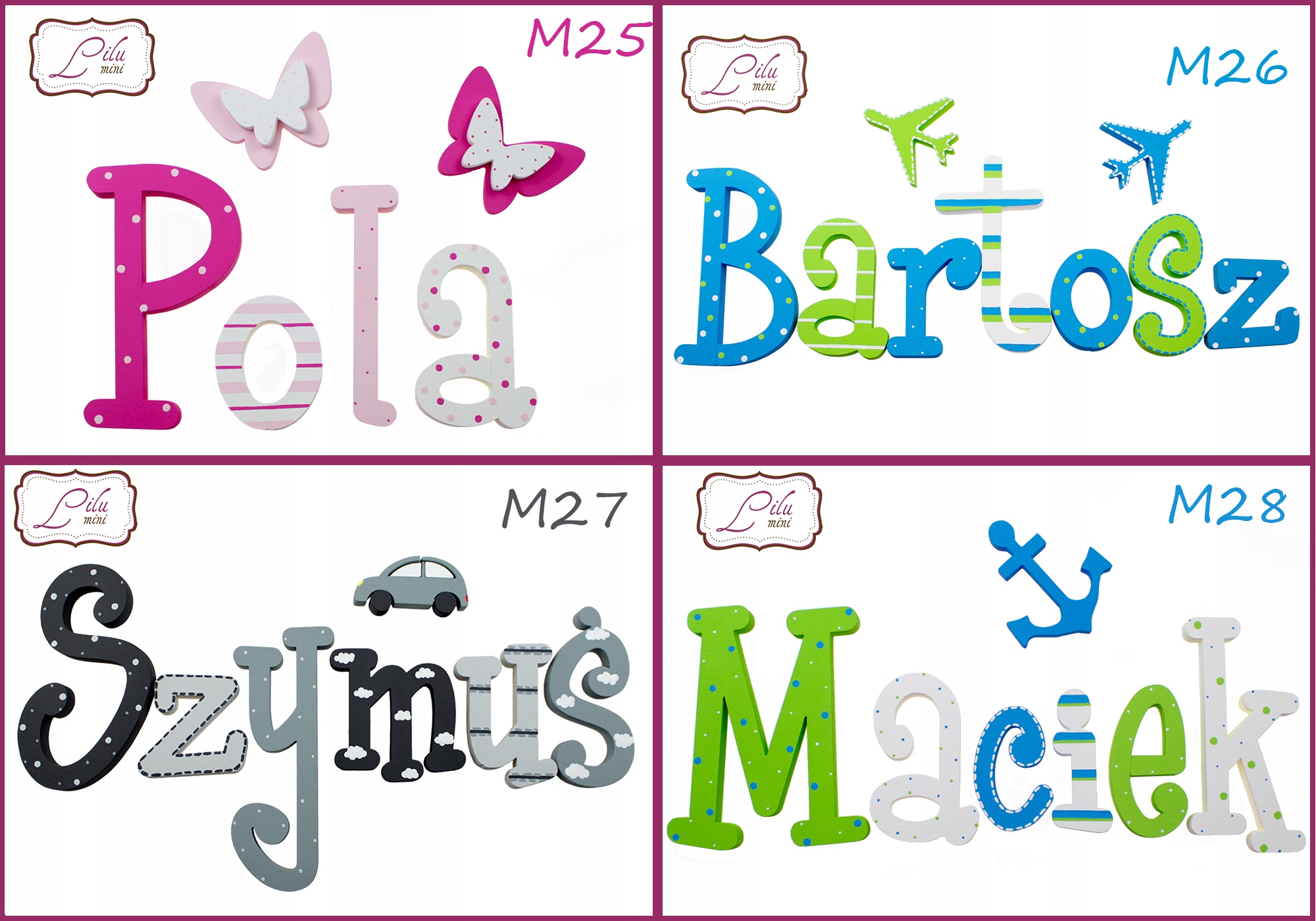 на выбор: бабочка, сердце, цветок, звезда, корона, машина, облако, музыкальная нота, якорь и самолет (цвета будут подобраны в соответствии с выбранным рисунком букв).