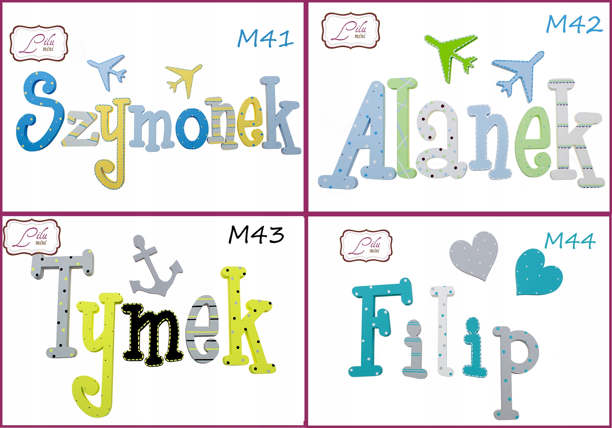 на выбор: бабочка, сердце, цветок, звезда, корона, машина, облако, музыкальная нота, якорь и самолет (цвета будут подобраны в соответствии с выбранным рисунком букв).