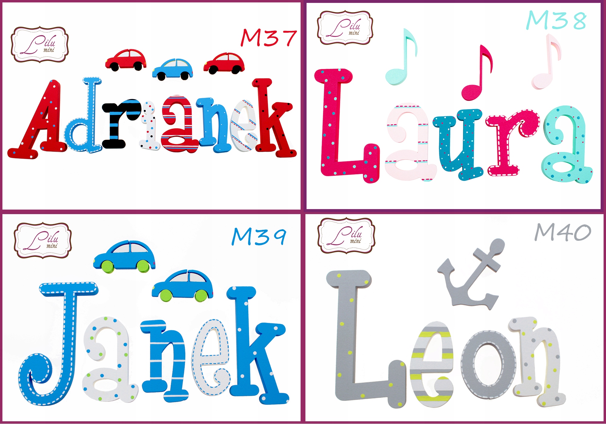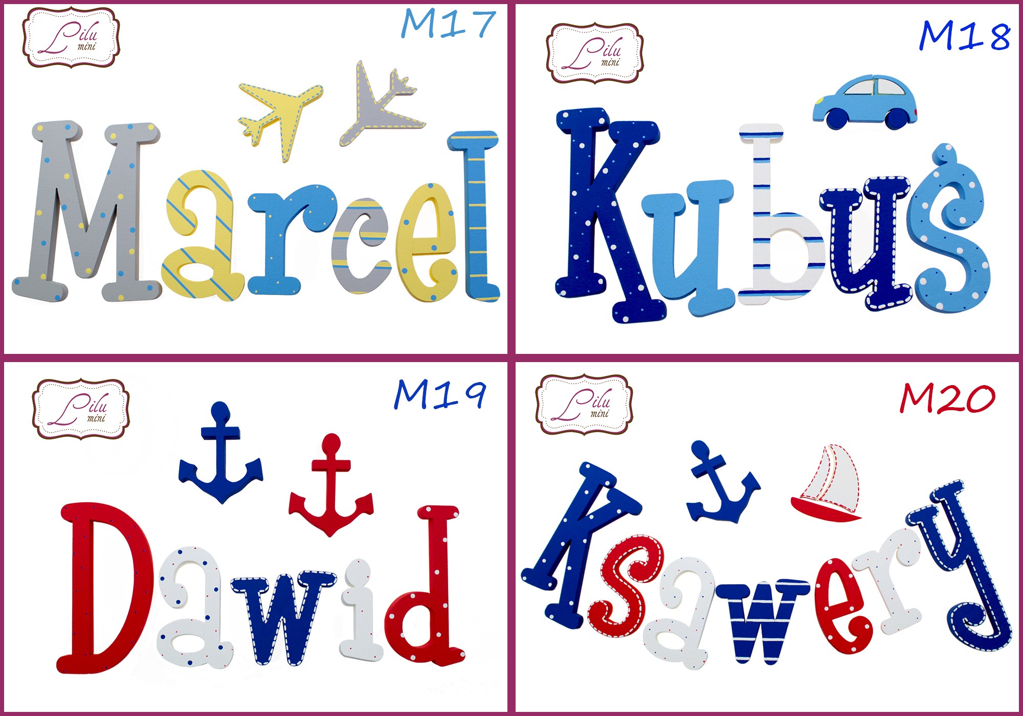 на выбор: бабочка, сердце, цветок, звезда, корона , машина, облако. музыкальная нота, якорь и самолет (цвета будут соответствовать выбранному рисунку букв).